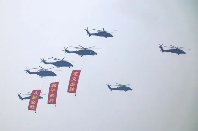 2025年9月3日,纪念中国人民抗日战争暨世界反法西斯战争胜利80周年大会在北京隆重举行。这是空中护旗梯队接受检阅。新华社记者 王婧嫱 摄