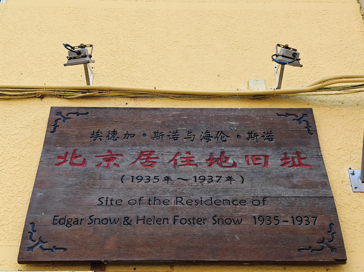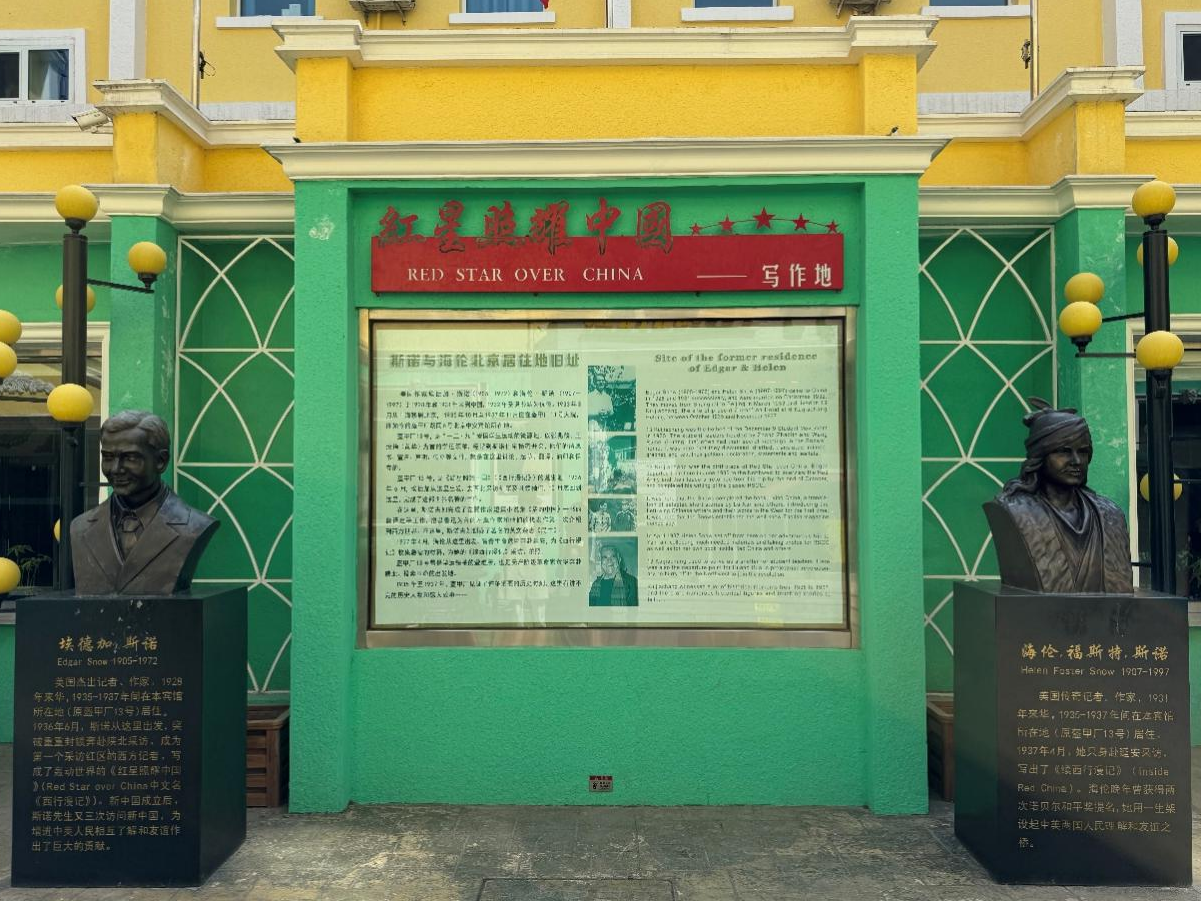 随后,支部一行移步至东城区盔甲厂胡同。与明城墙的雄浑不同,这条幽静的小巷藏着一段动人心弦的红色记忆。走进胡同,一方小巧而静谧的院落映入眼帘,这里正是埃德加·斯诺与海伦·斯诺夫妇20世纪30年代在京居所旧址。一场关于《红星照耀中国》历史事迹的展览徐徐展开。四组展柜以英文书名“Red Star Over China”为基座,陈列着珍贵的纪念章、老照片与历史报纸。墙上的老照片定格了斯诺夫妇的生活场景——庇护进步学生的勇敢身影,启程前往陕北的坚定神情,以及伏案写作的专注模样。书柜里收藏着各个时期、不同语种的《红星照耀中国》版本,无言地诉说着这部著作穿越时空的影响力。