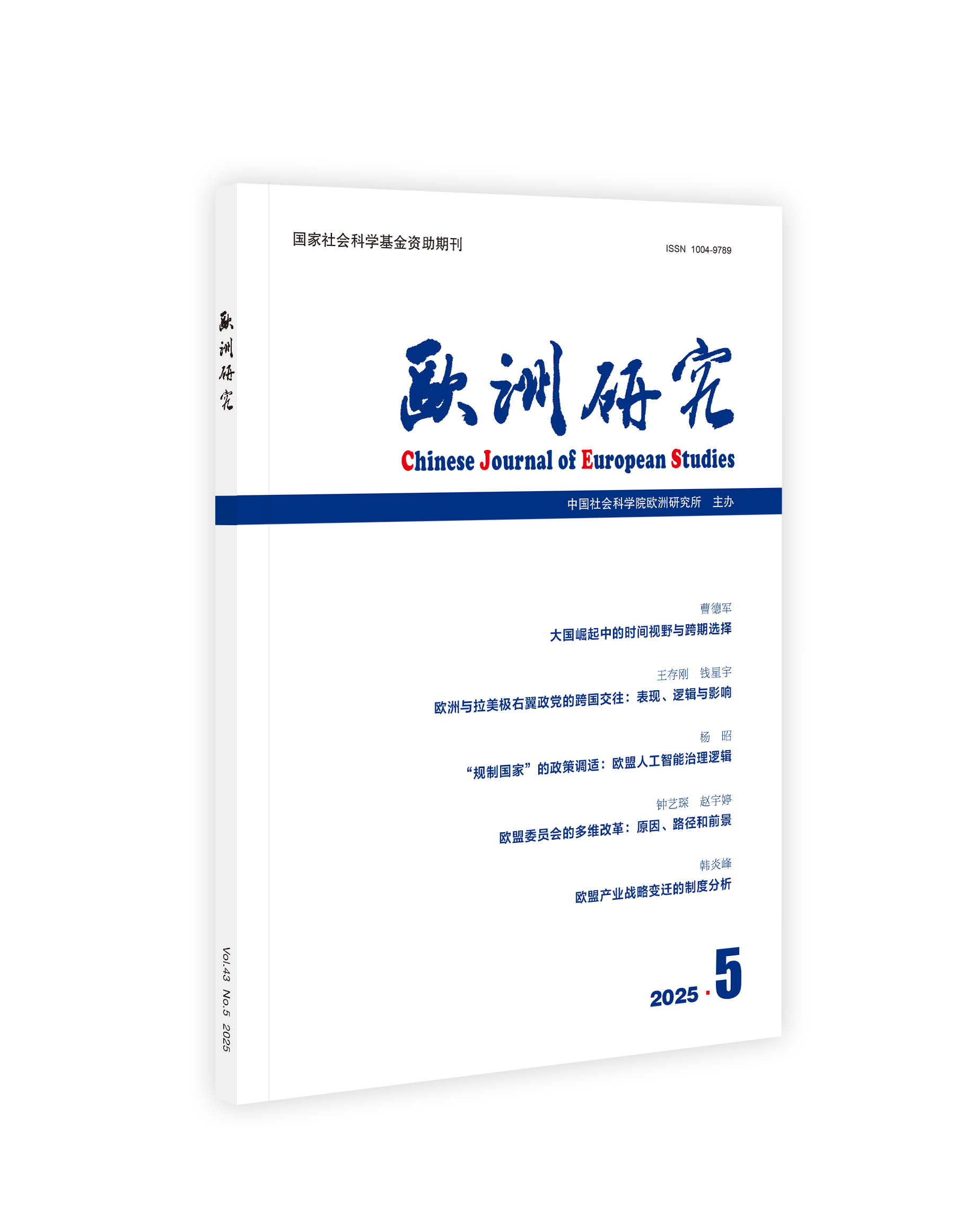 《欧洲研究》2025年第5期 2025-11-20 0 □ 国际政治经济评论 1 大国崛起中的时间视野与跨期选择——基于19世纪末20世纪初德国与美国的案例分析 曹德军 22 欧洲与拉美极右翼政党的跨国交往:表现、逻辑与影响 王存刚 钱星宇 52 “规制国家”的政策调适:欧盟人工智能治理逻辑 杨 昭 □ 欧洲一体化 79 欧盟委员会的多维改革:原因、路径和前景 钟艺琛 赵宇婷 108 欧盟产业战略变迁的制度分析 韩炎峰 128 外生危机背景下欧盟对成员国“民主倒退”的监管反复 李炳萱