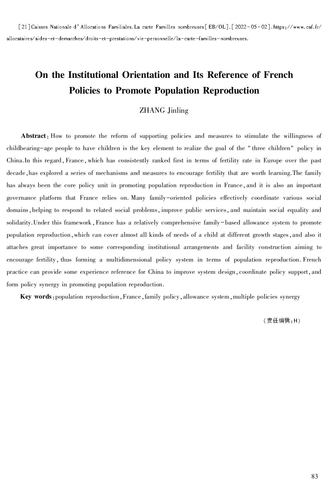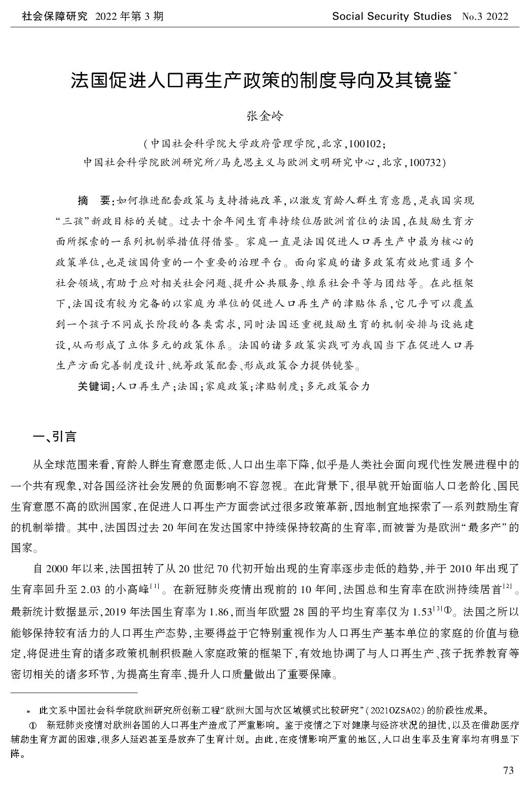 张金岭:法国促进人口再生产政策的制度导向及其镜鉴 2022-10-08 张金岭 《社会保障研究》,2022年第3期 0 作者简介:张金岭,中国社会科学院欧洲研究所研究员。 文章来源:《社会保障研究》,2022年第3期。已获得作者授权。
