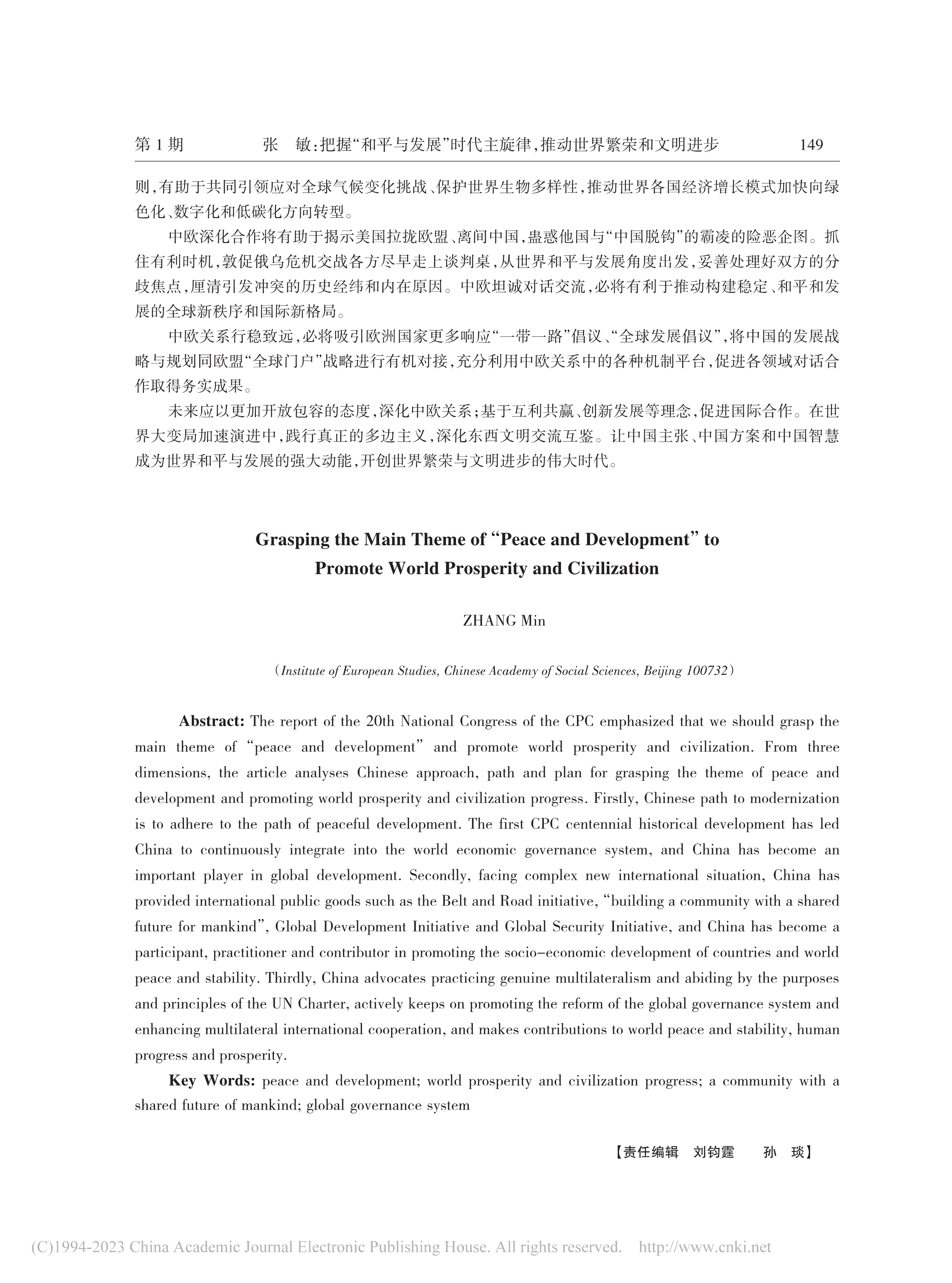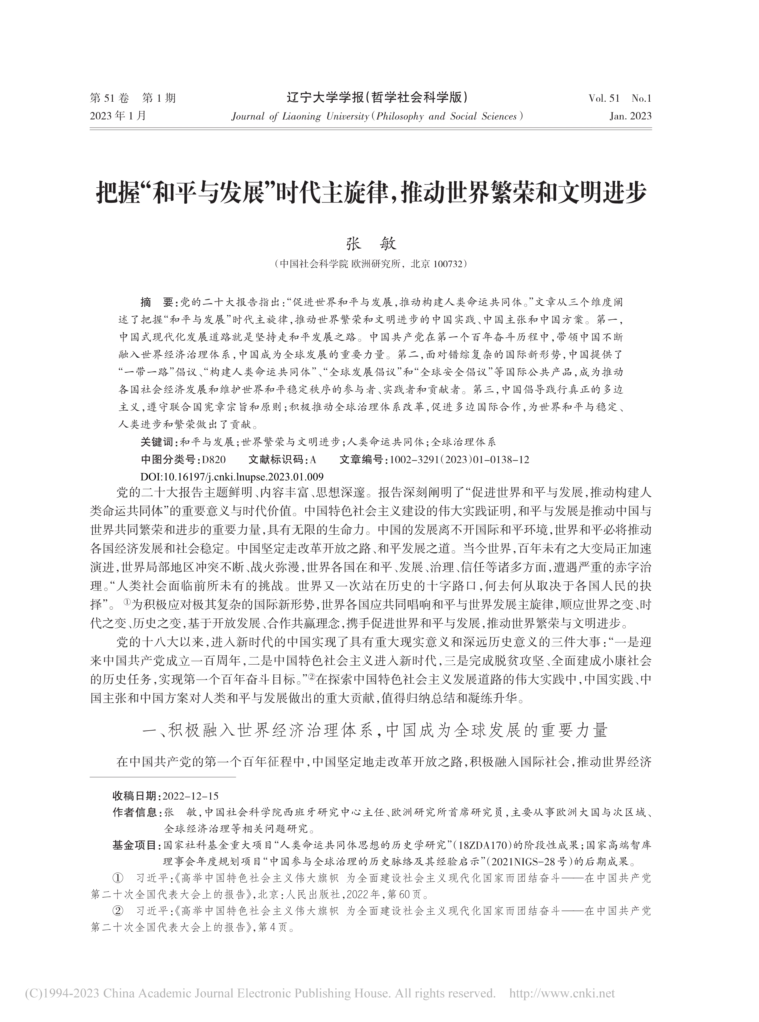 张敏:把握“和平与发展”时代主旋律,推动世界繁荣和文明进步 2023-05-09 张敏 《辽宁大学学报(哲学社会科学版)》,2023年第1期 0 作者简介:张敏,中国社会科学院欧洲研究所研究员。 文章来源:《辽宁大学学报(哲学社会科学版)》,2023年第1期。已获得作者授权。