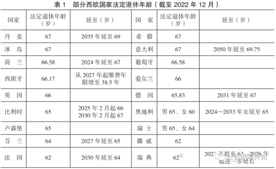 和改变养老金计发方式、调整缴费率等措施相比,延长退休年龄是高度显性的,容易引发反对,为此各国纷纷采取了渐进、弹性的方式,以“月”“季度”等为单位逐步延长,同时配套以正向和反向的激励措施,即提前退休减扣养老金、延后退休增加养老金。意大利等国则在法定退休年龄和预期寿命之间建立了自动关联上调机制。由表1可见,西欧绝大多数国家的法定退休年龄已延至65岁以上,同时以灵活的姿态,允许重体力等从事“艰苦”“有害健康”工作的劳动者或很早便开始职业生涯、缴费年限足够长的劳动者提前退休而不减扣养老金(法国、德国、瑞典等)。在退休年龄存在公私部门差异的国家(在意大利、英国、法国,公共部门退休年龄低于私人部门),为提高延迟退休的合法性、降低改革的阻力,往往先把两者的退休年龄拉齐,之后再共同延至同一水平。