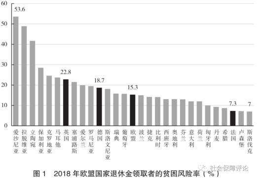 综上,和当前的退休者相比,未来几代退休者的养老金收益将面临更多的变数,其贫困风险也将随之提升。正如牛津大学教授伯恩哈德·艾宾浩斯(Bernhard Ebbinghaus)指出的,“公共养老金和私人养老金相混合的制度将众多老年人置于危险之中,因为他们缺乏足够的与收入关联的补充养老金。”事实证明,在多支柱的混合制度中,公共养老金支柱占比低的国家的退休者贫困风险更高;反之公共养老金占比高的国家贫困风险更低。如图1所示:在欧盟28国中,法国作为公共养老金支柱占绝对优势的国家,退休者的贫困风险几乎最低(7.3%),是欧盟平均水平(15.3%)的一半。英国高达22.8%,是法国的3倍;德国和瑞典紧随其后。英国、德国和瑞典退休者的贫困风险在西欧国家中名列前茅。艾宾浩斯也指出,英国、瑞士等基本养老金支柱薄弱的国家具有相对中高的贫困风险;德国正在产生中等水平的贫困;而法国和一些南欧国家的贫困率较低。英国作为欧洲养老金市场化程度最高的国家之一,近三十年来老年极端贫困率和极端贫困速度的上升在西欧国家均名列前茅。2021年英国媒体指出,英国有近五分之一的养老金领取者生活在贫困中,这是自2012年以来的最高水平。