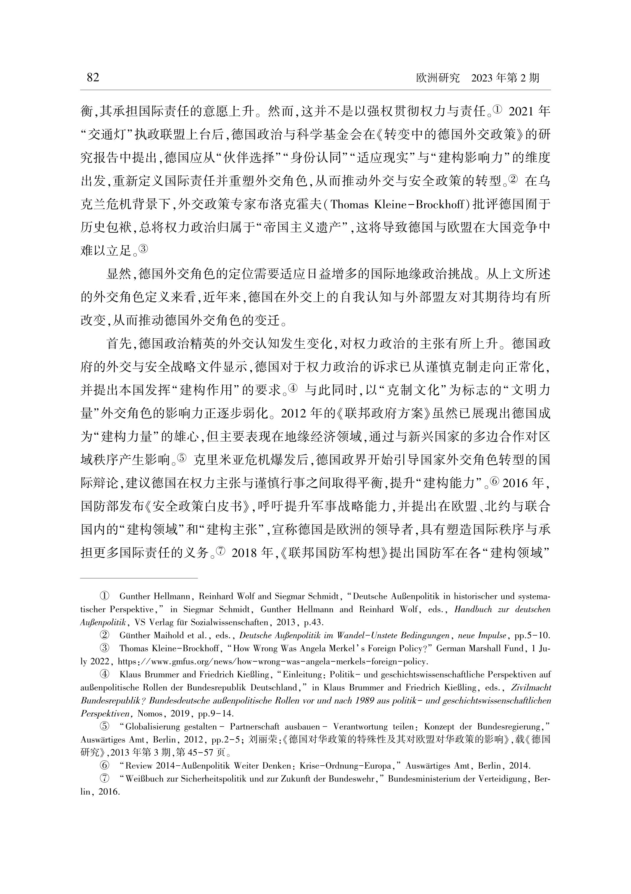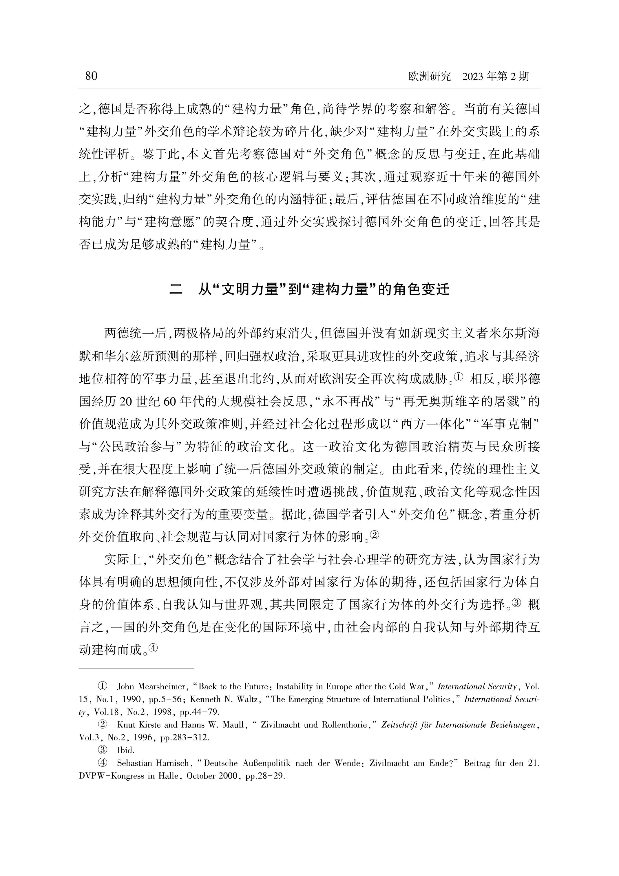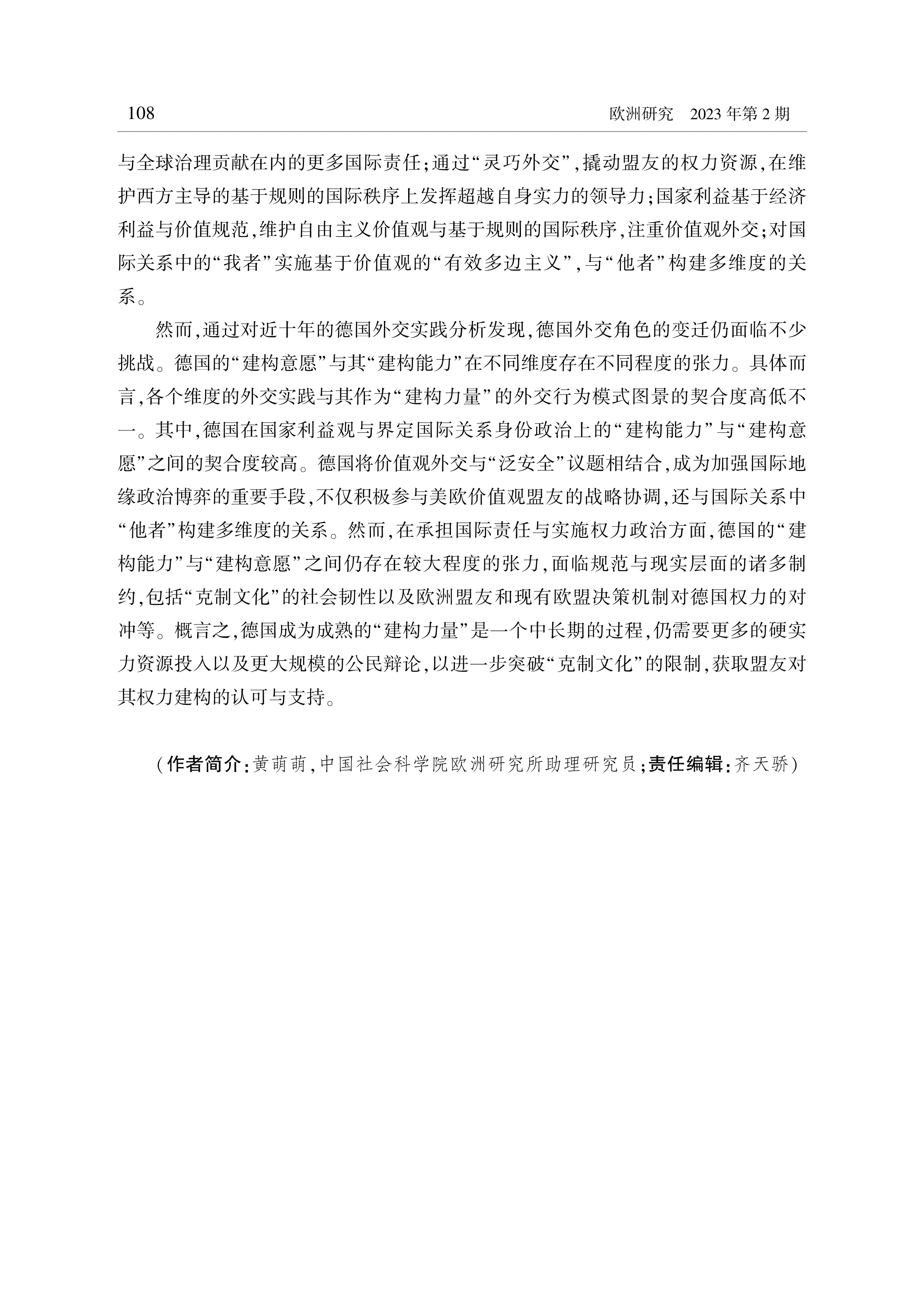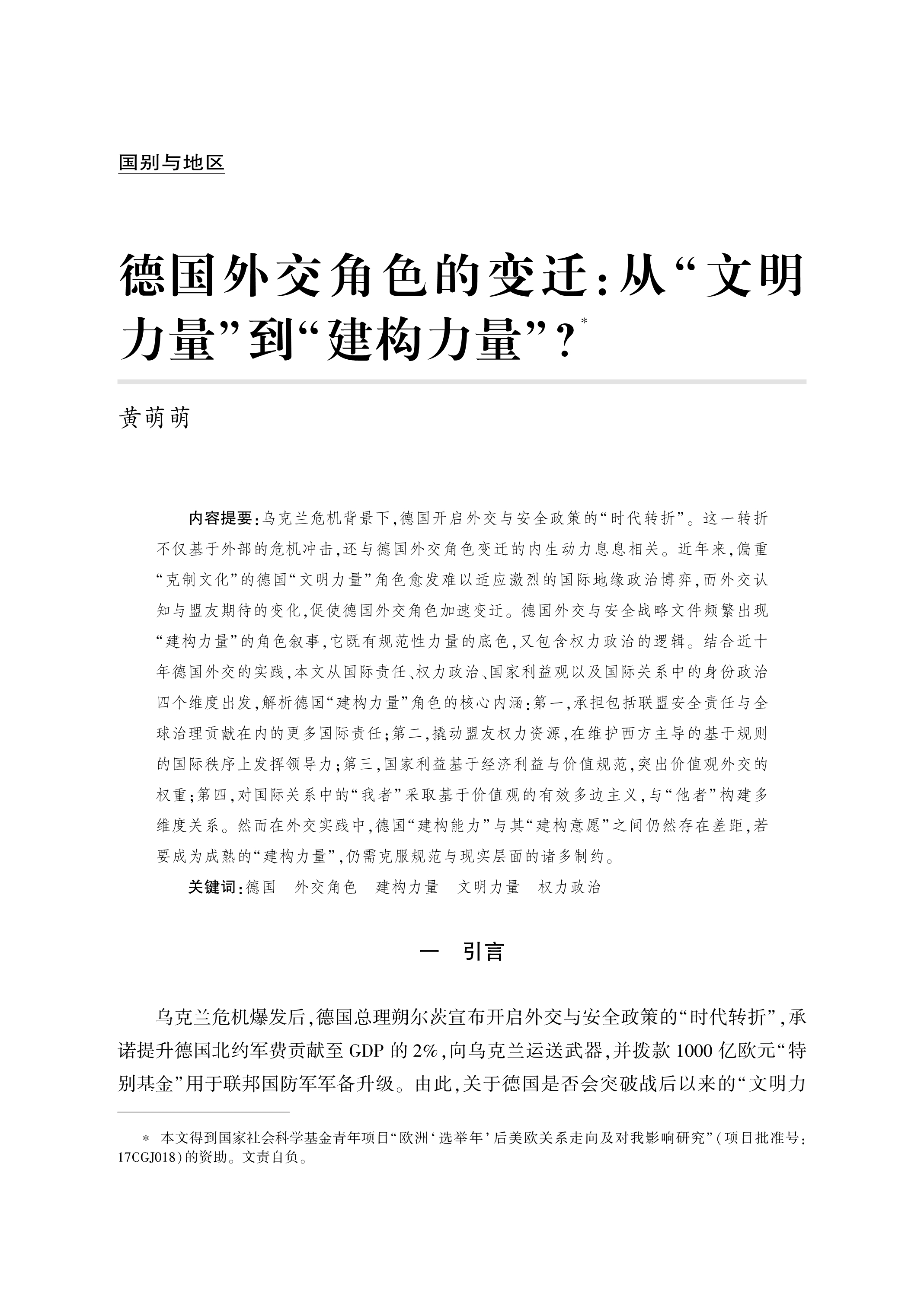 黄萌萌:德国外交角色的变迁:从“文明力量”到“建构力量”? 2023-06-26 黄萌萌 《欧洲研究》,2023年第2期 0 作者简介:黄萌萌,中国社会科学院欧洲研究所助理研究员。 文章来源:《欧洲研究》,2023年第2期。已获得作者授权。