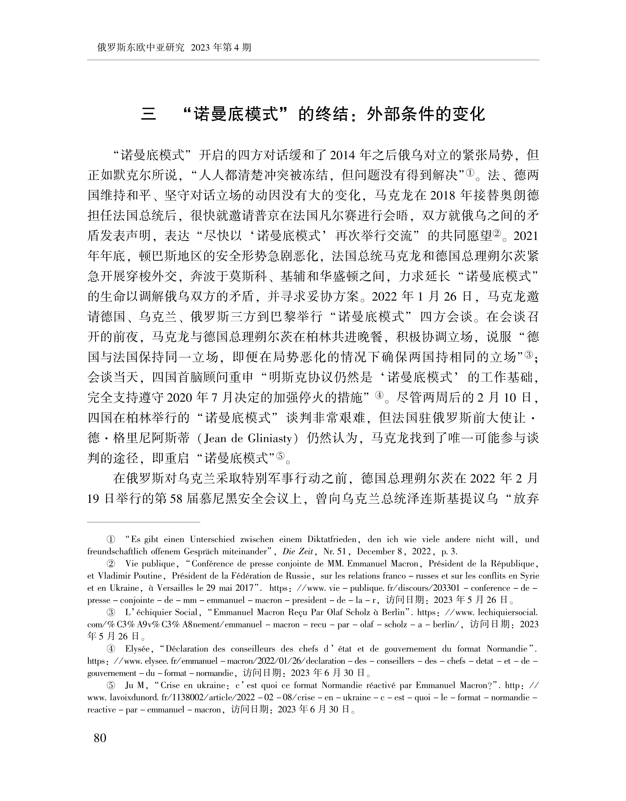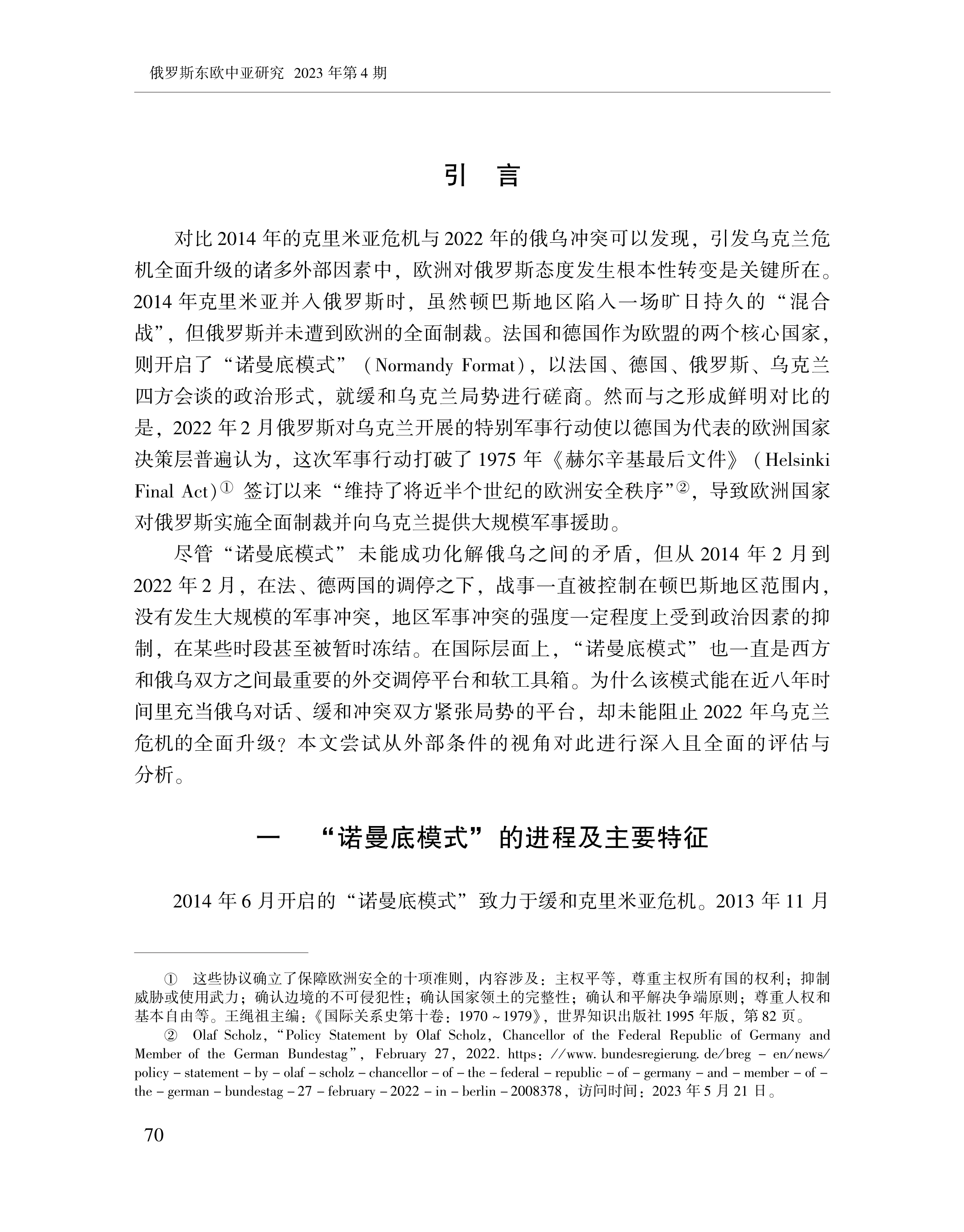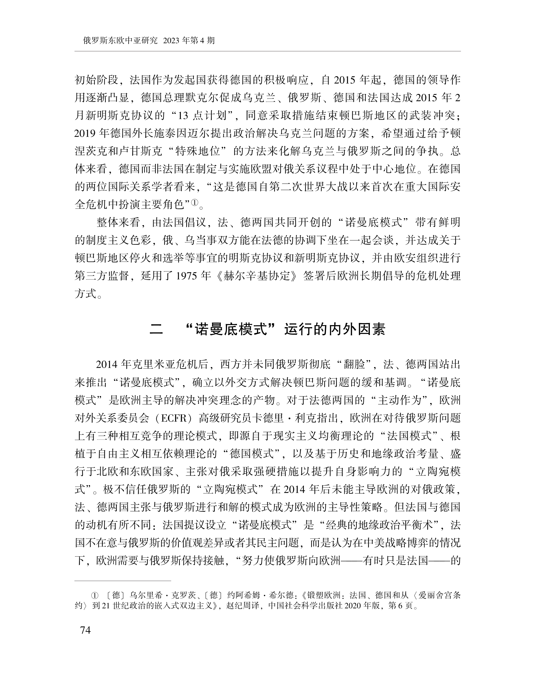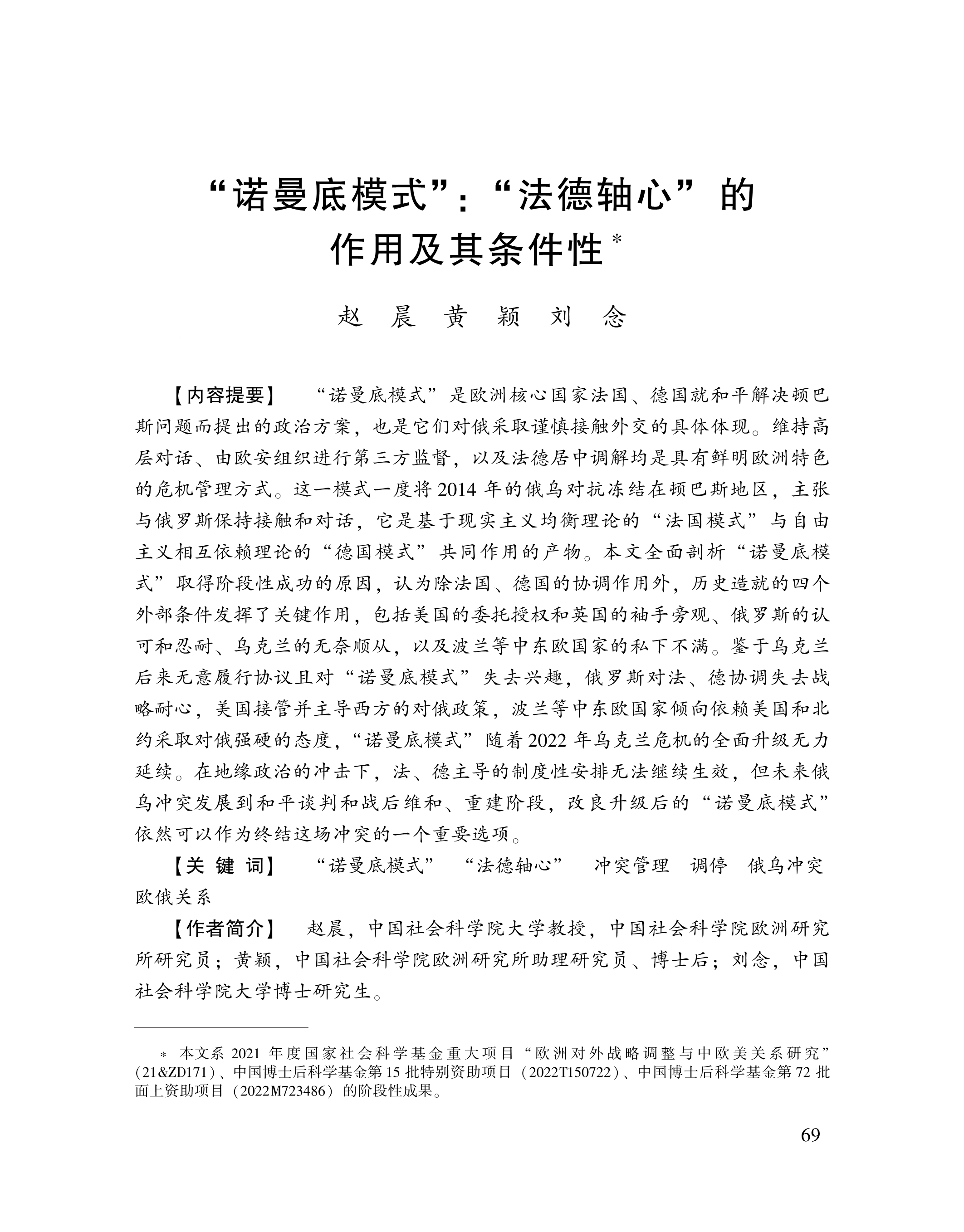 赵晨、黄颖、刘念:“诺曼底模式”:“法德轴心”的作用及其条件性 2023-07-24 赵晨、黄颖、刘念 《俄罗斯东欧中亚研究》,2023年第4期 0 作者简介: 赵晨,中国社会科学院欧洲研究所研究员。 黄颖,中国社会科学院欧洲研究所助理研究员、博士后。 刘念,中国社会科学院大学博士研究生。 文章来源:《俄罗斯东欧中亚研究》,2023年第4期。已获得作者授权。