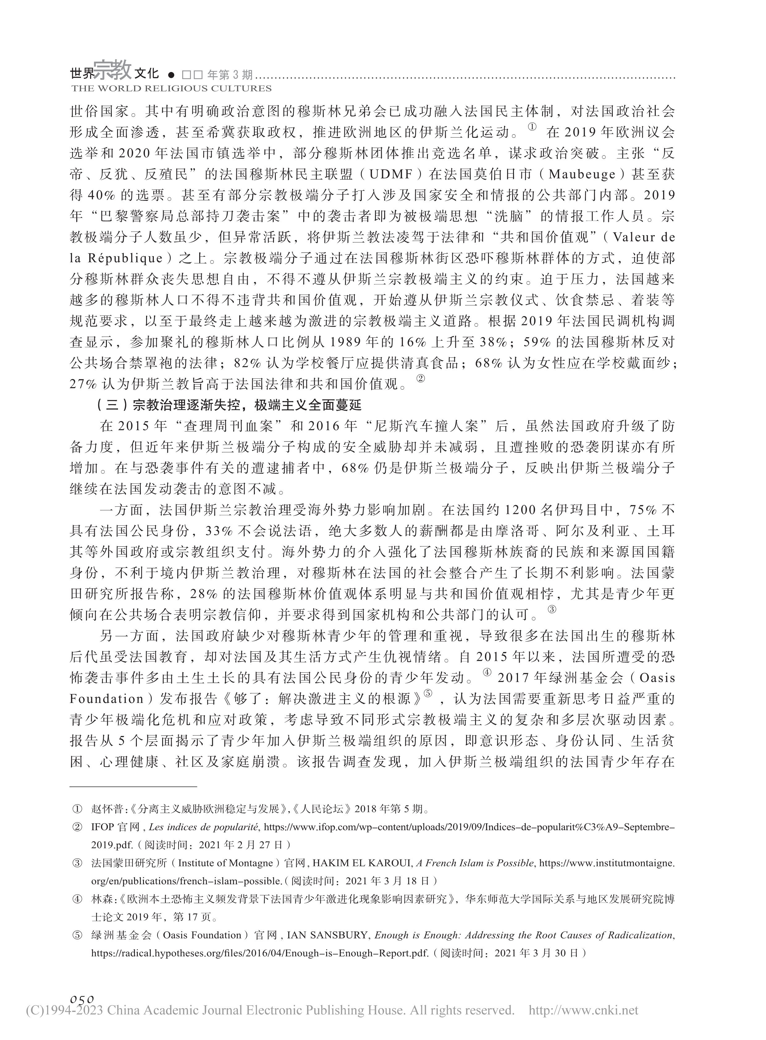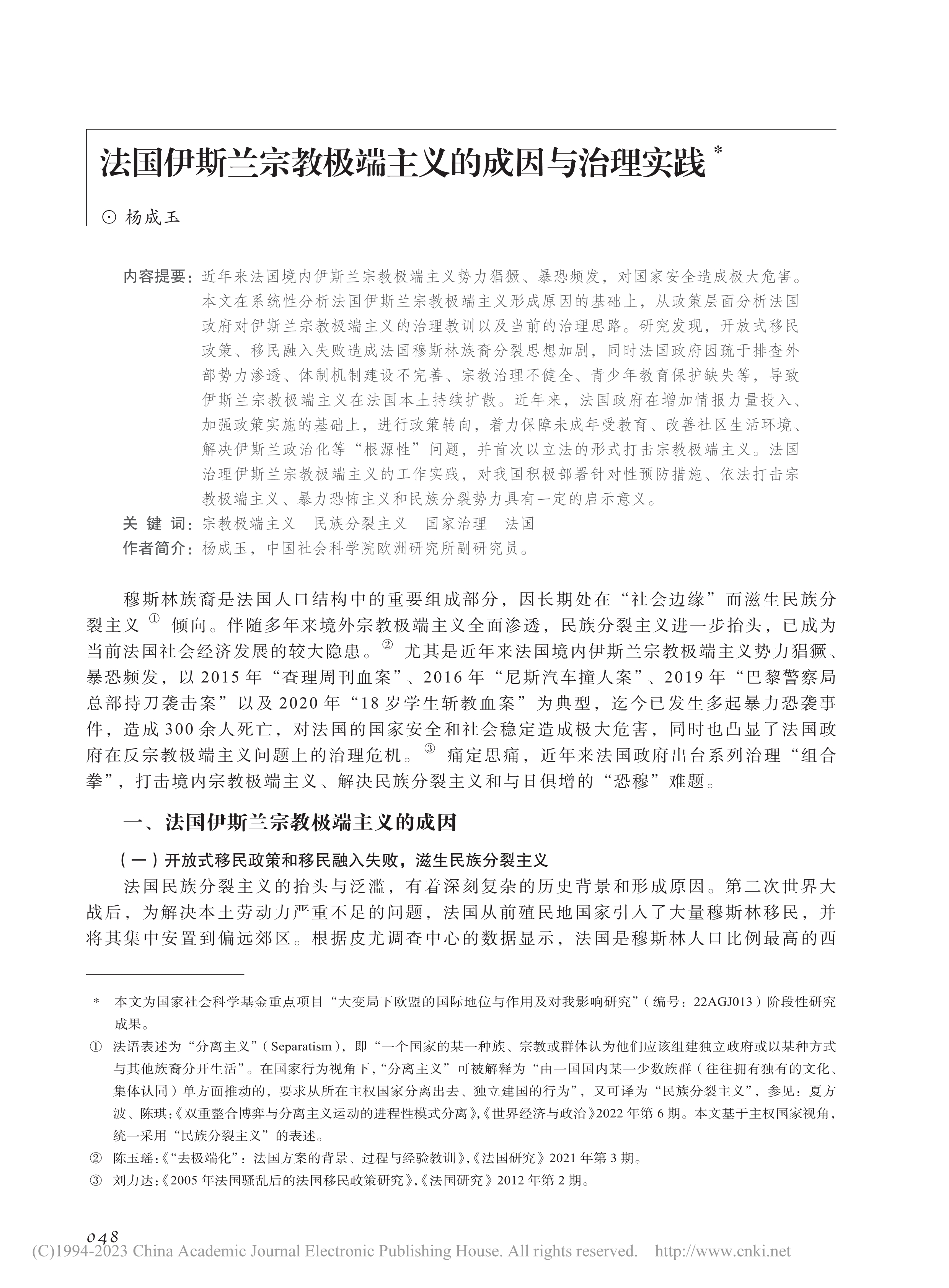 杨成玉:法国伊斯兰宗教极端主义的成因与治理实践 2023-07-27 杨成玉 《世界宗教文化》,2023年第3期 0 作者简介:杨成玉,中国社会科学院欧洲研究所副研究员。 文章来源:《世界宗教文化》,2023年第3期。已获得作者授权。