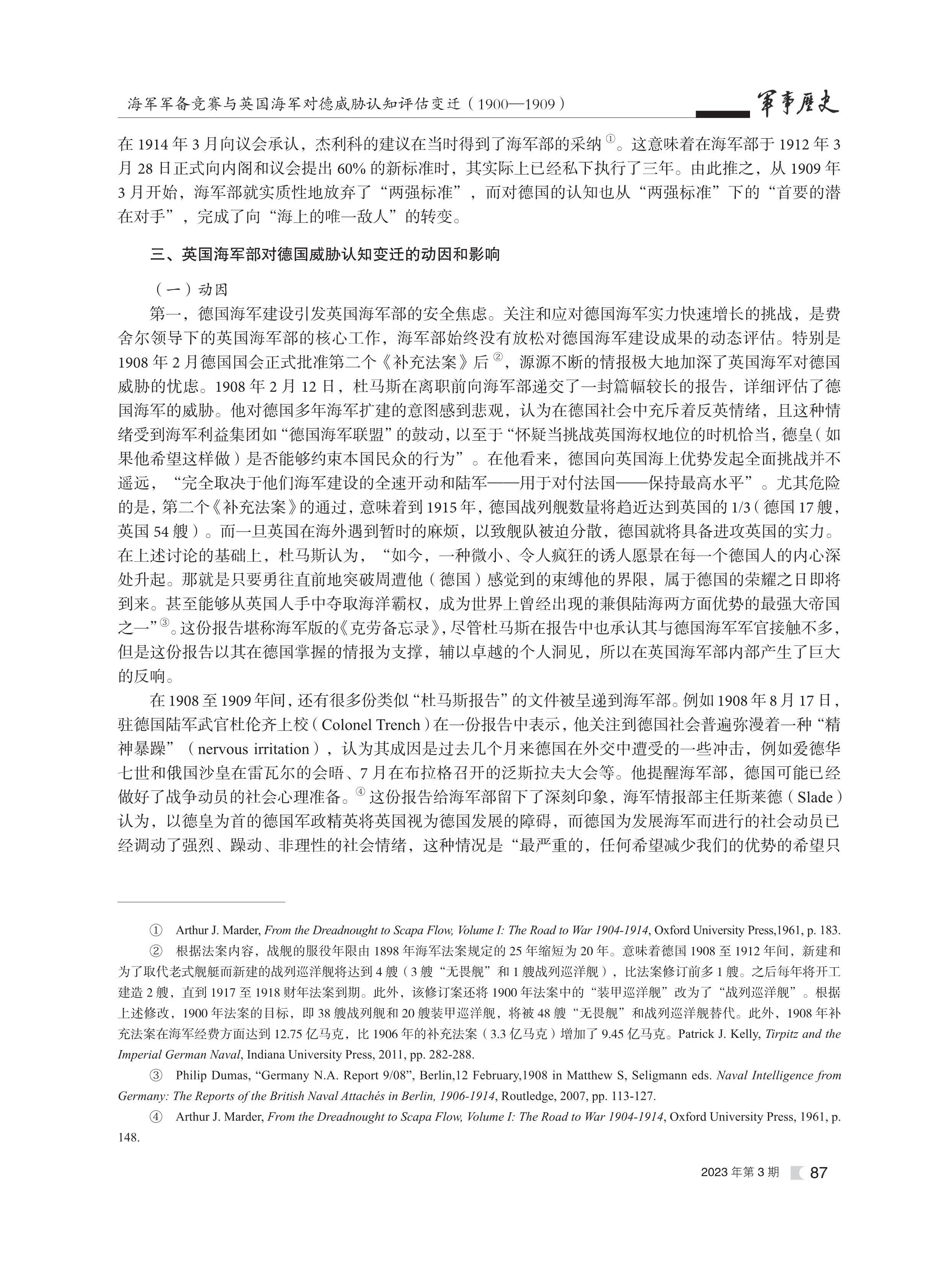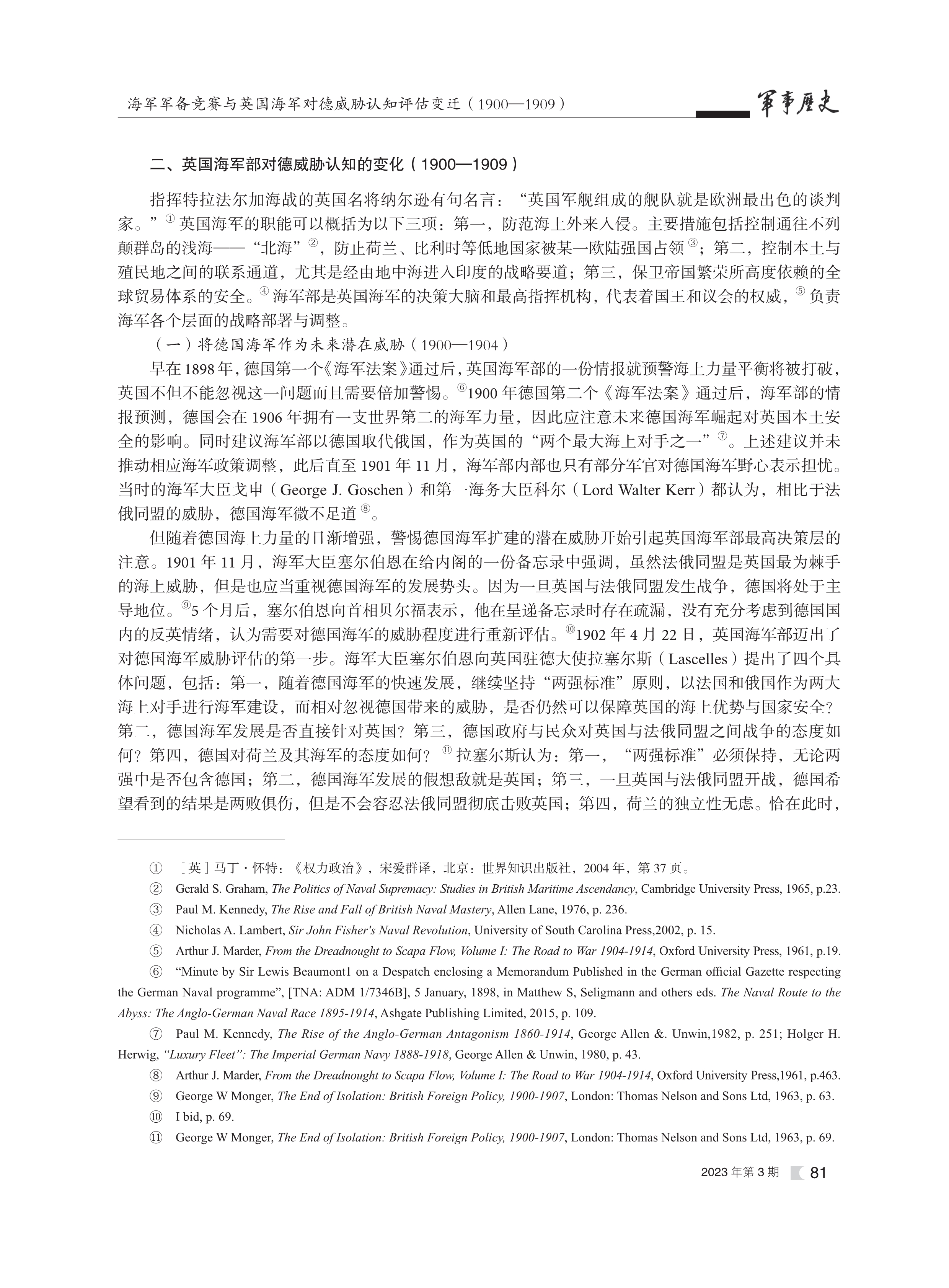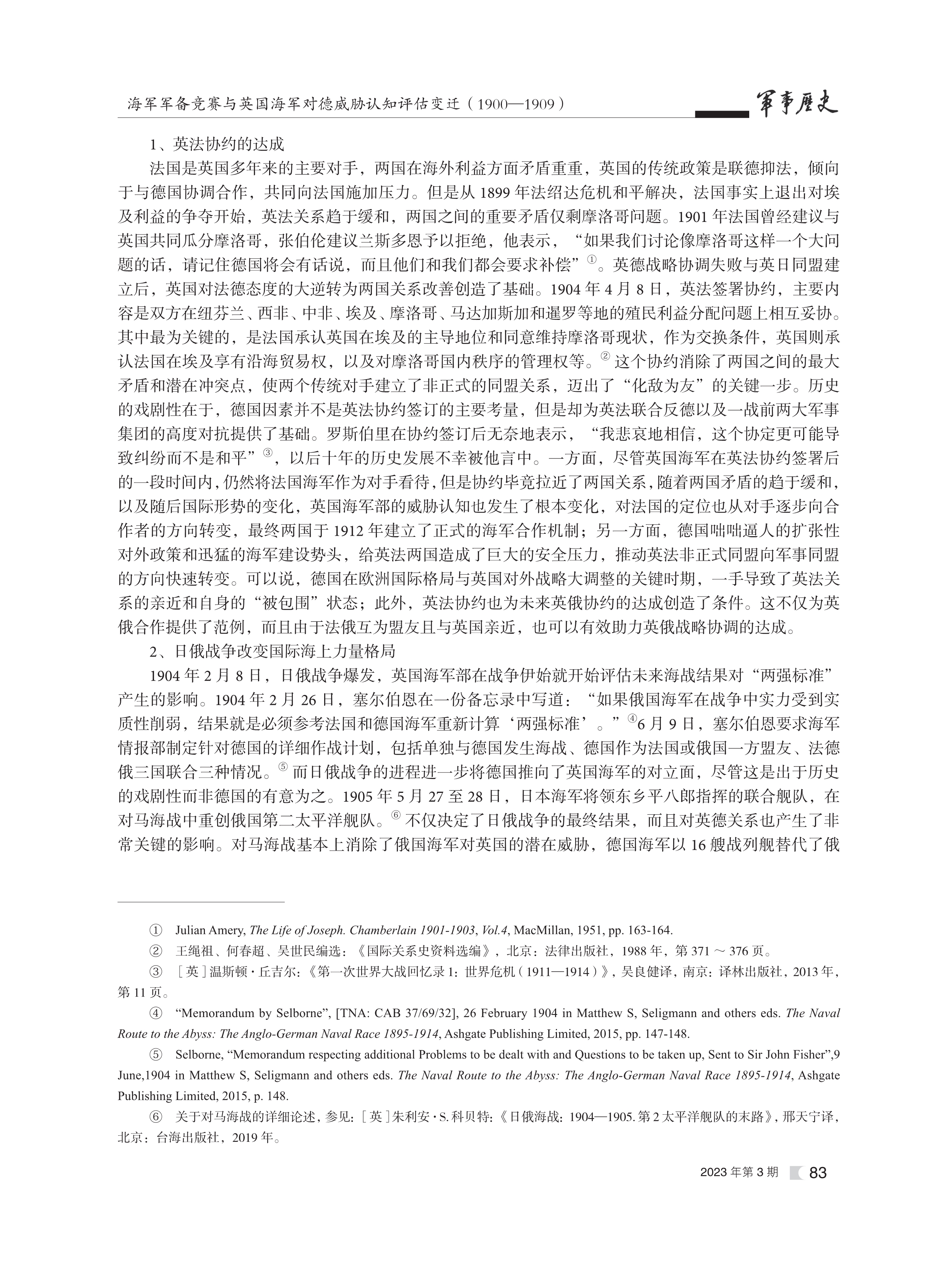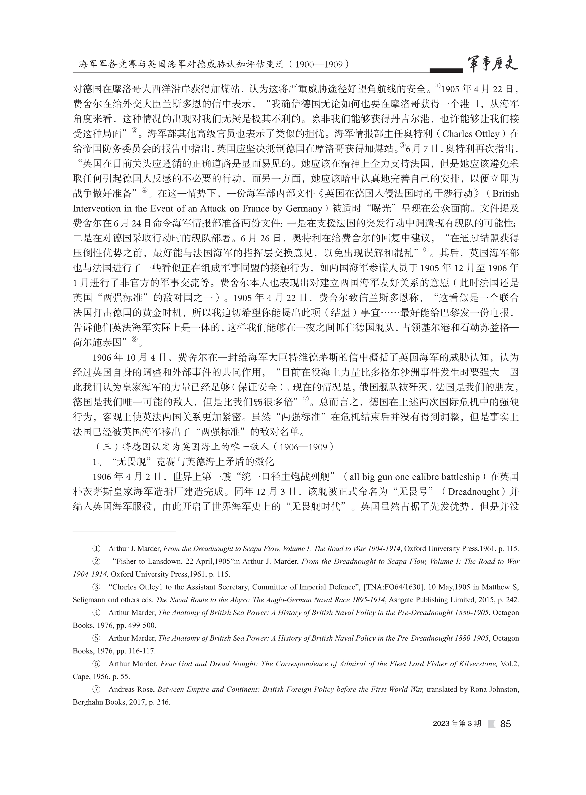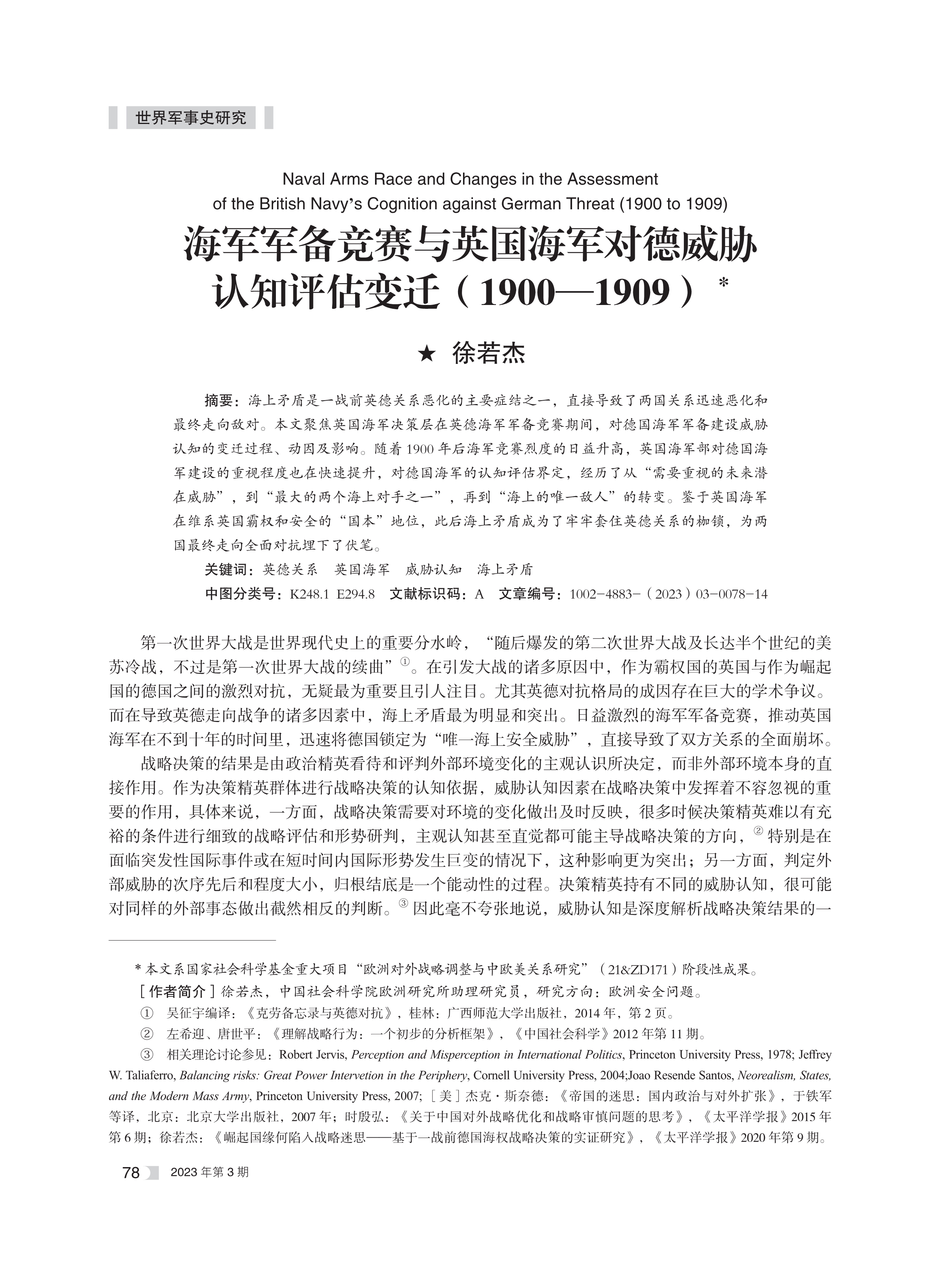 徐若杰:海军军备竞赛与英国海军对德威胁认知评估变迁(1900—1909) 2023-10-18 徐若杰 《军事历史》,2023年第3期 0 作者简介:徐若杰,中国社会科学院欧洲研究所助理研究员。 文章来源:《军事历史》,2023年第3期。已获得作者授权。