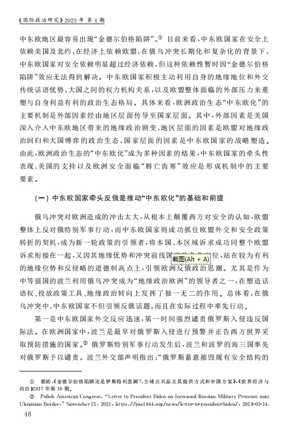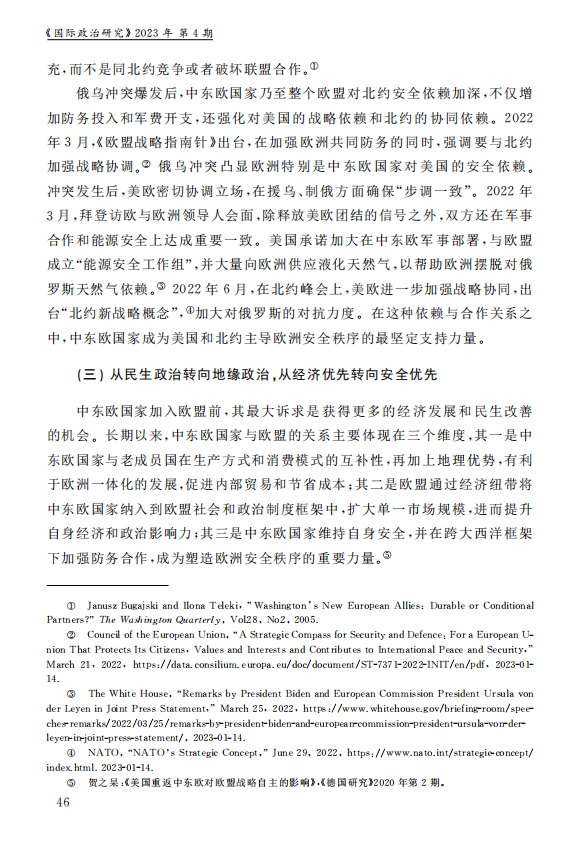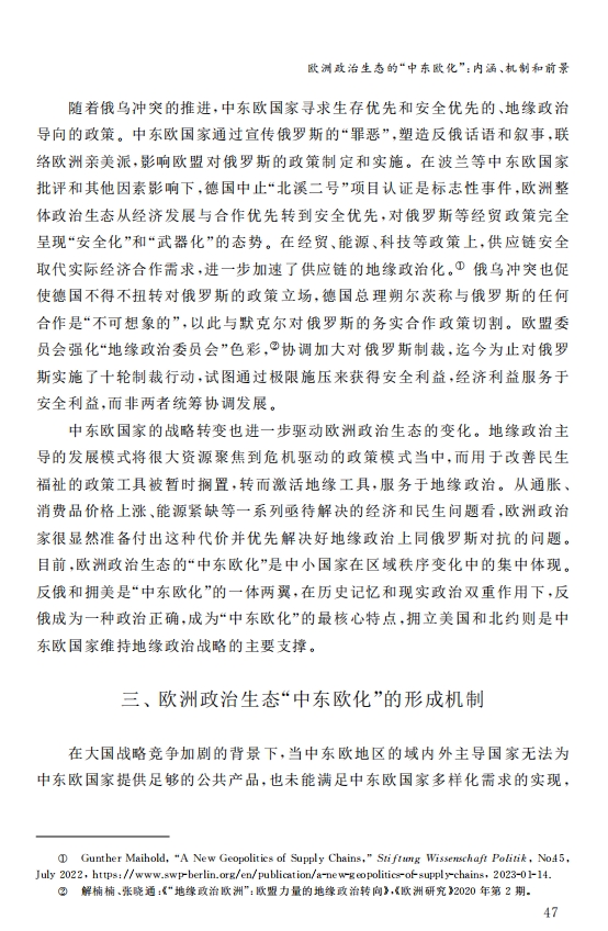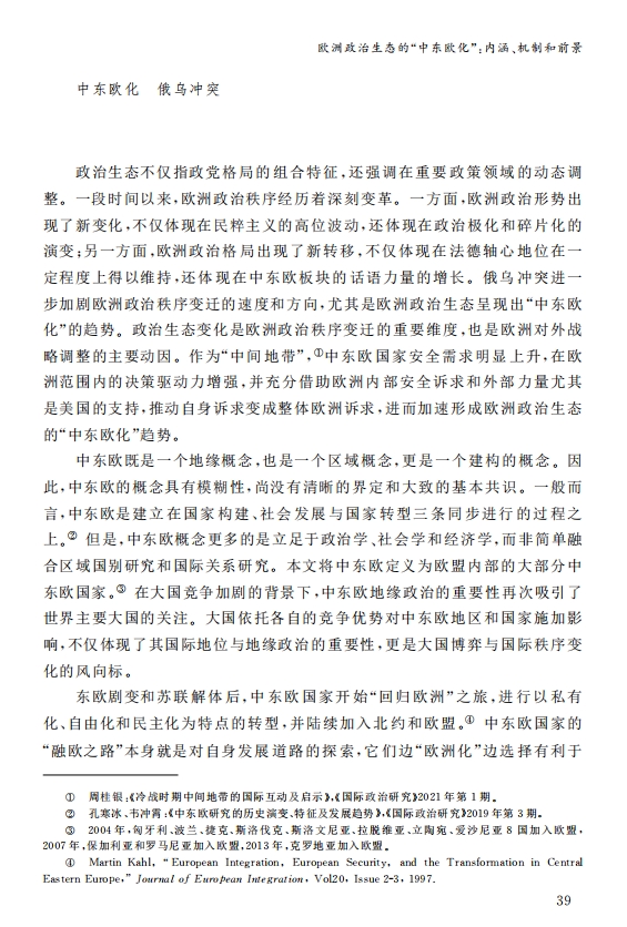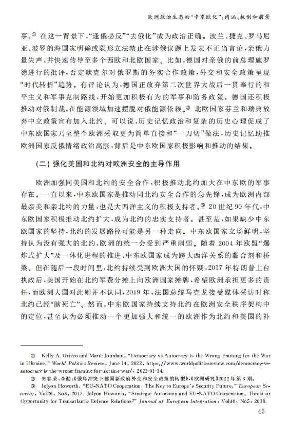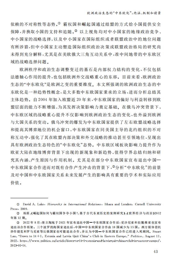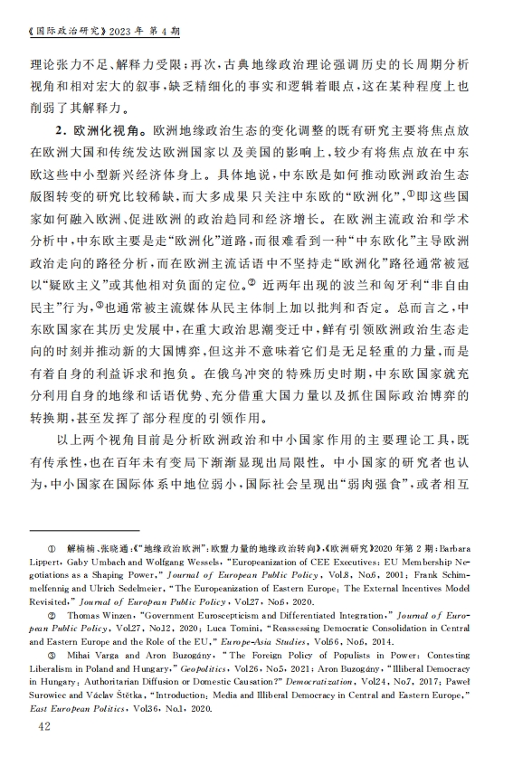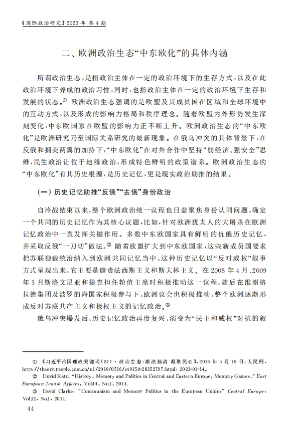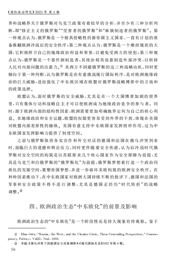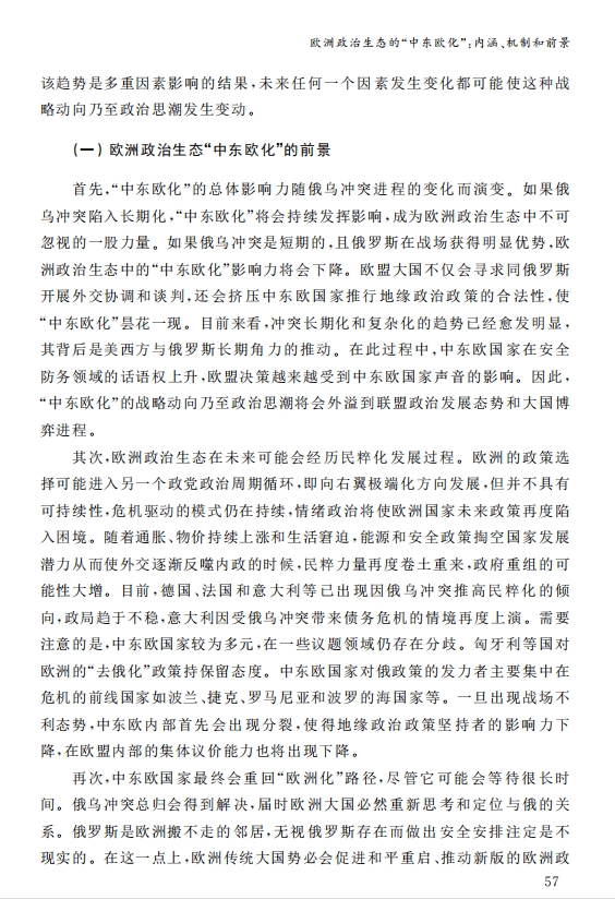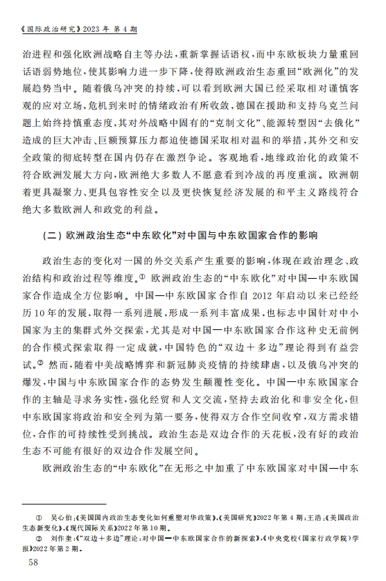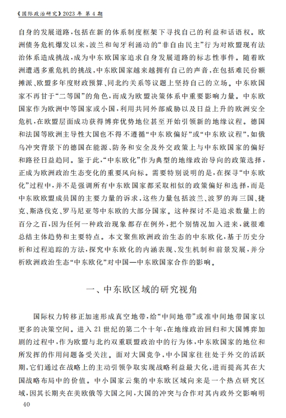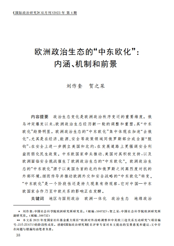 刘作奎、贺之杲:欧洲政治生态的“中东欧化”:内涵、机制和前景 2023-11-07 刘作奎、贺之杲 《国际政治研究》(双月刊),2023年第4期 0 作者简介:刘作奎,中国社会科学院欧洲研究所副所长、研究员。 贺之杲,中国社会科学院欧洲研究所副研究员。 文章来源:《国际政治研究》(双月刊),2023年第4期。已获得作者授权。