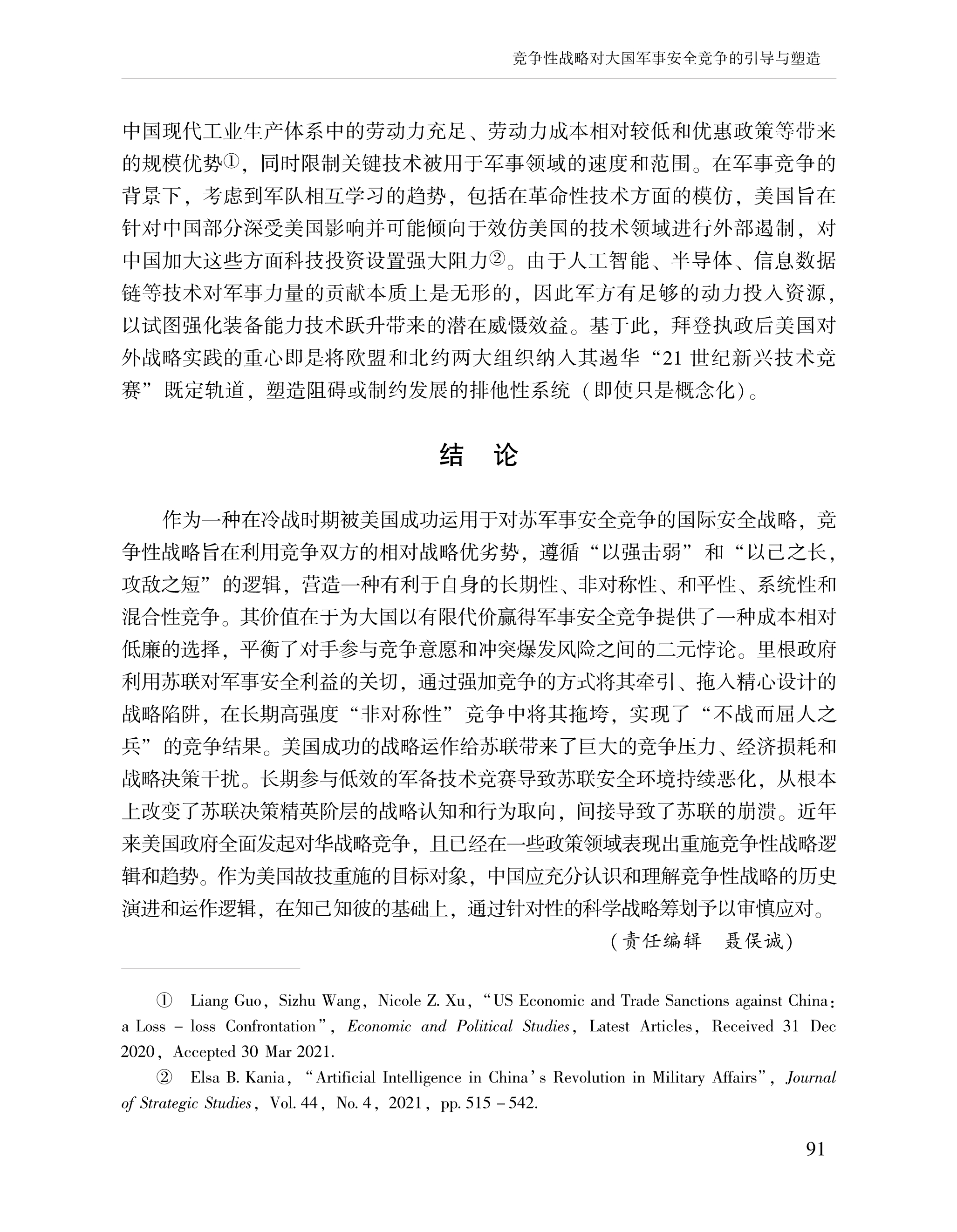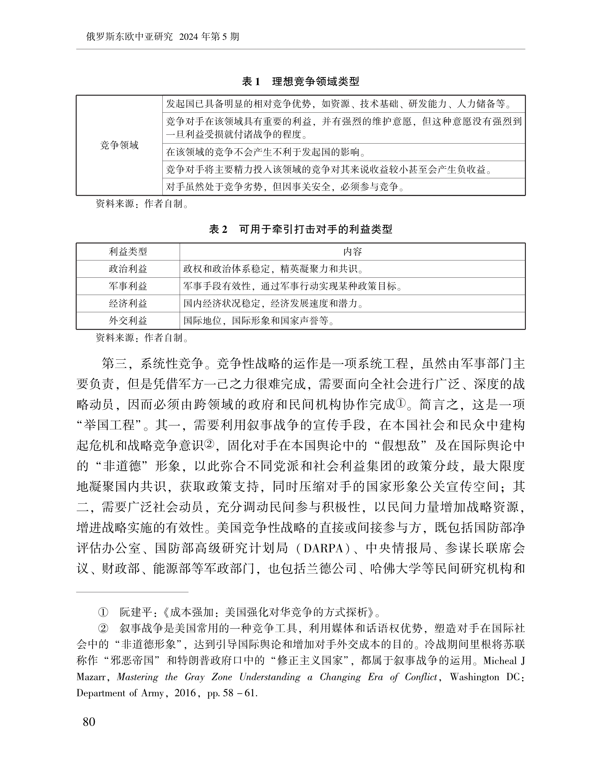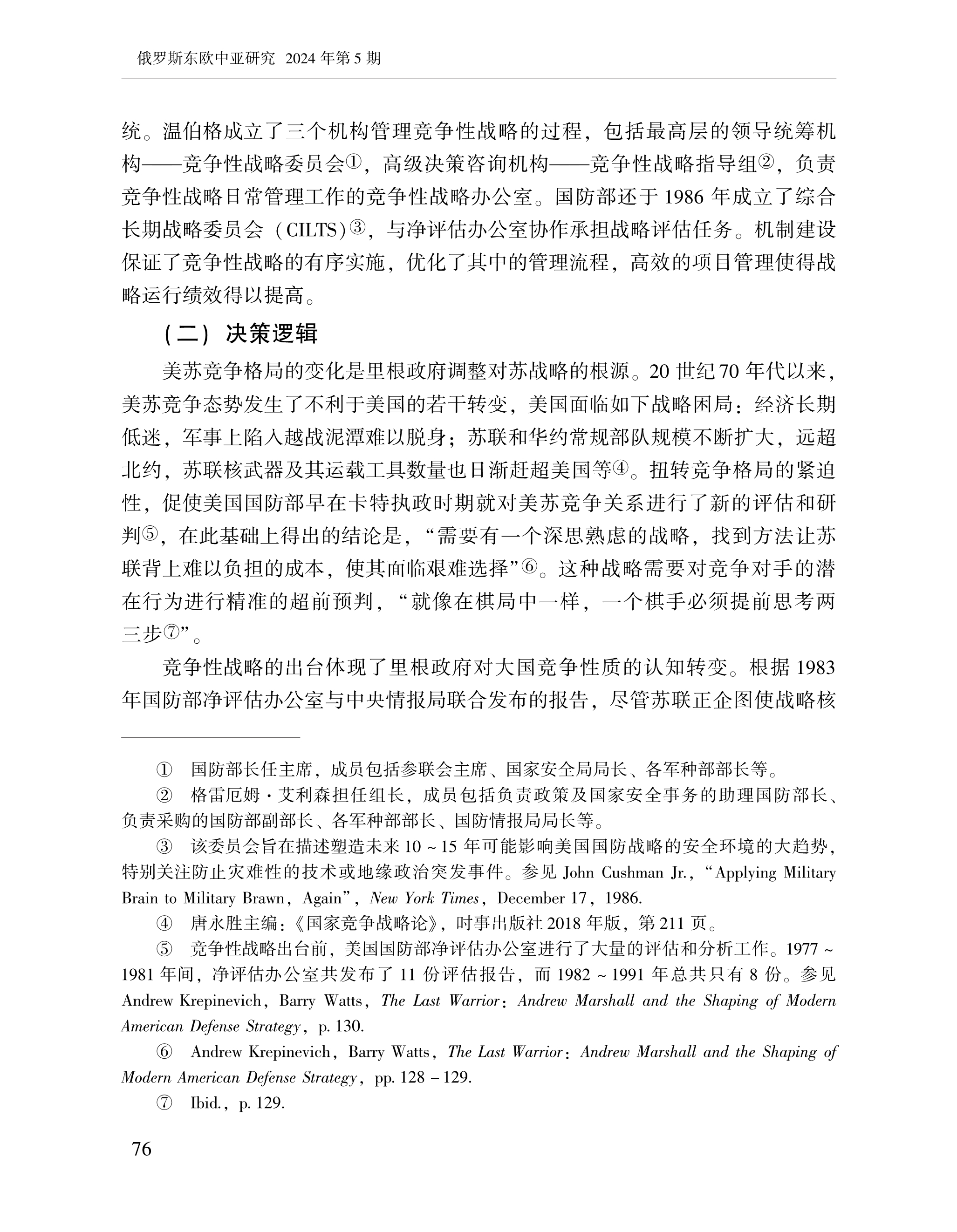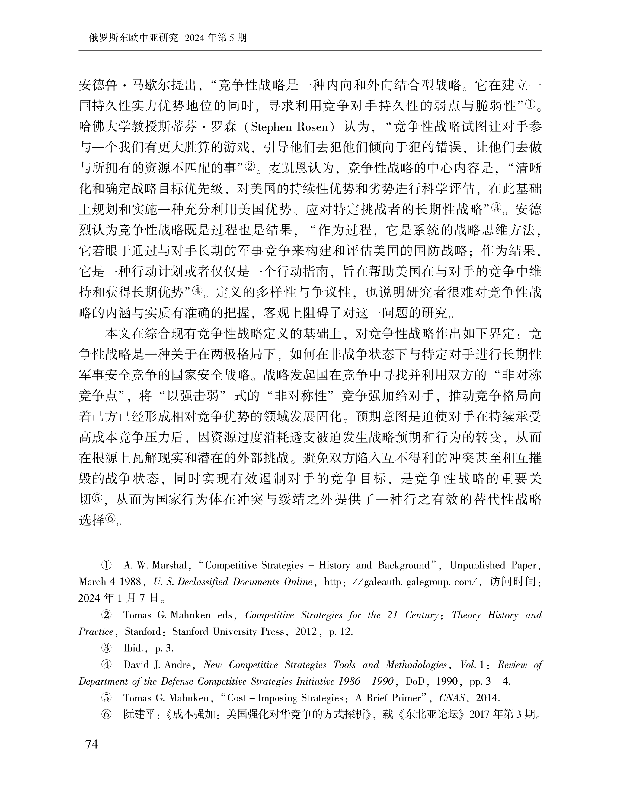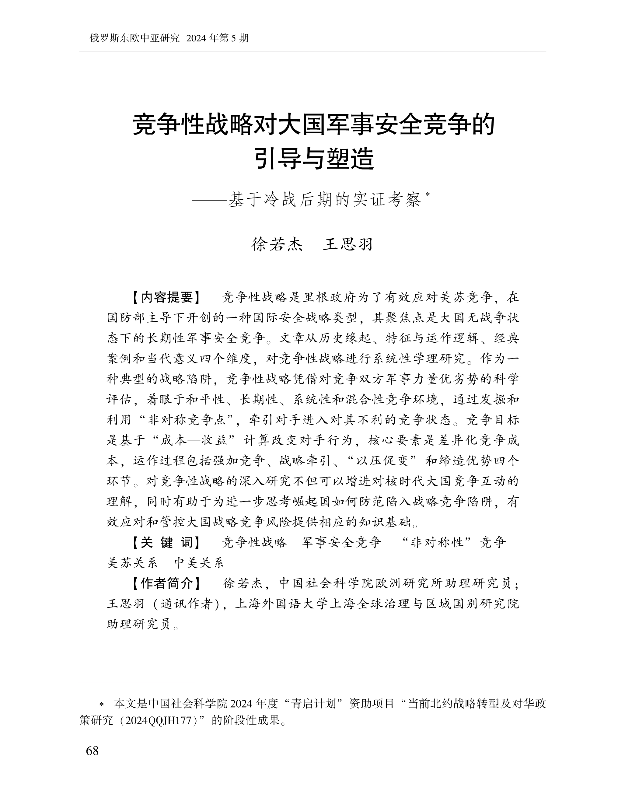 徐若杰、王思羽:竞争性战略对大国军事安全竞争的引导与塑造——基于冷战后期的实证考察 2024-10-17 徐若杰、王思羽 《俄罗斯东欧中亚研究》,2024年第5期 0 作者简介:徐若杰,中国社会科学院欧洲研究所助理研究员。 王思羽(通讯作者):上海外国语大学上海全球治理与区域国别研究院助理研究员。 文章来源:《俄罗斯东欧中亚研究》,2024年第5期。已获得作者授权。