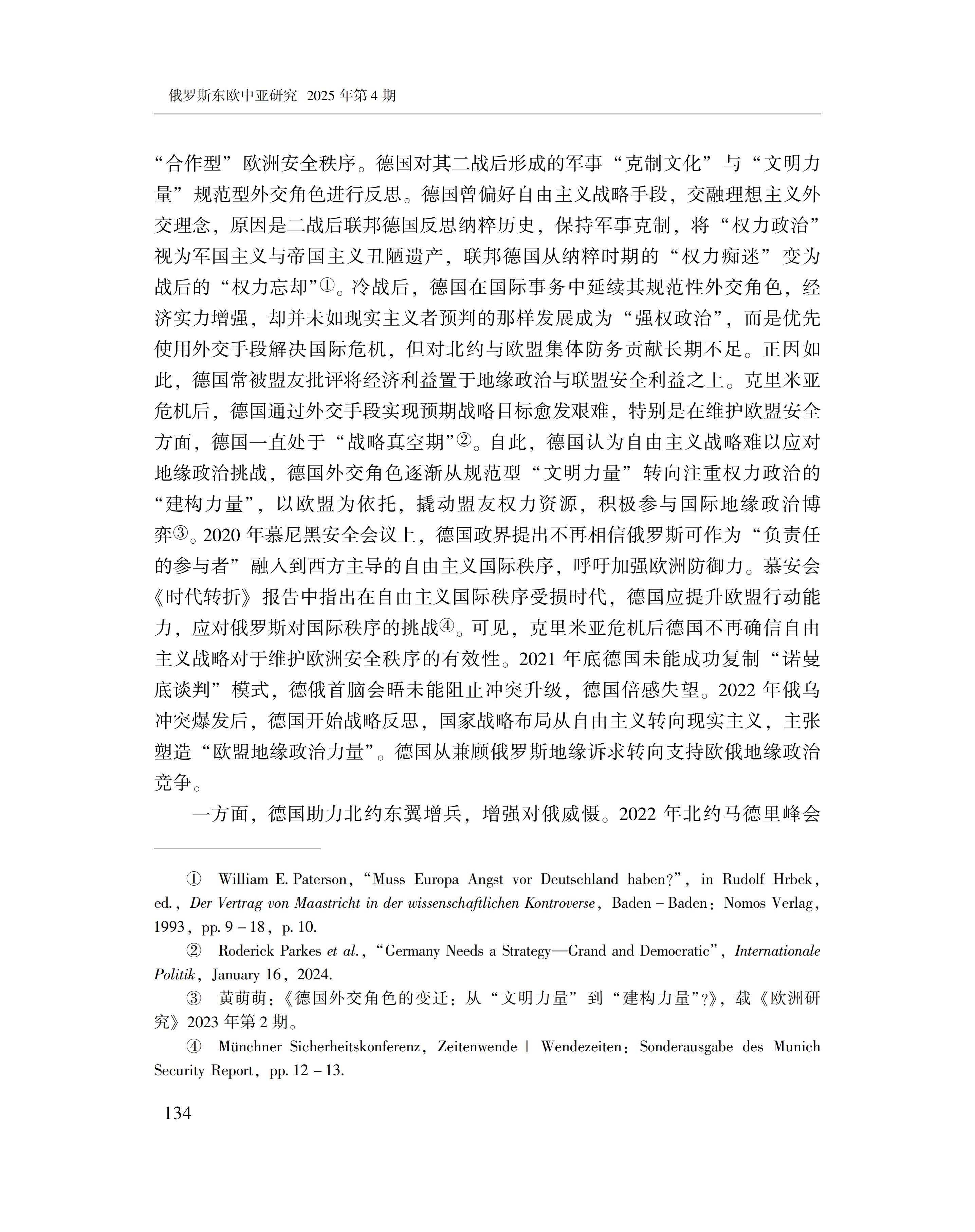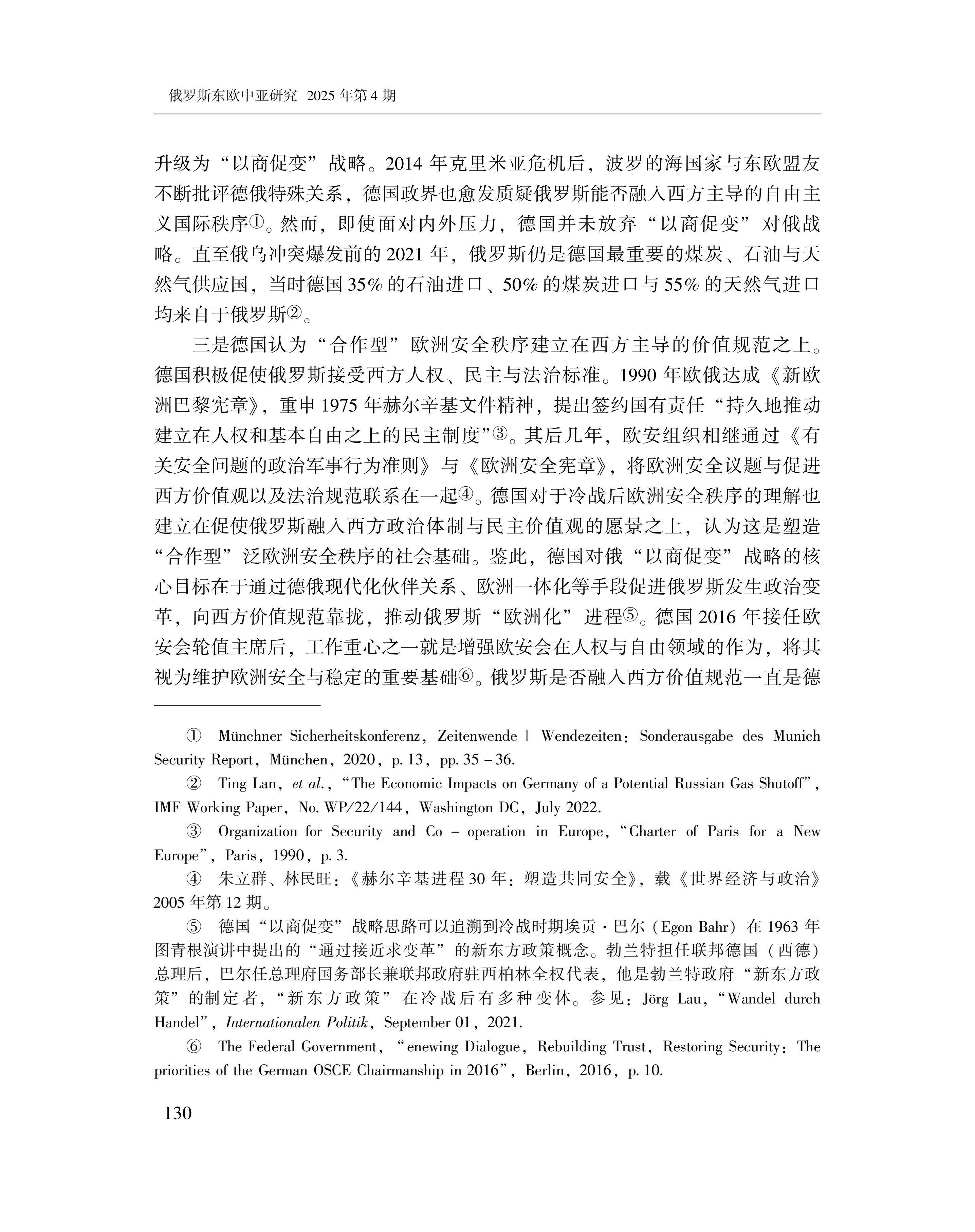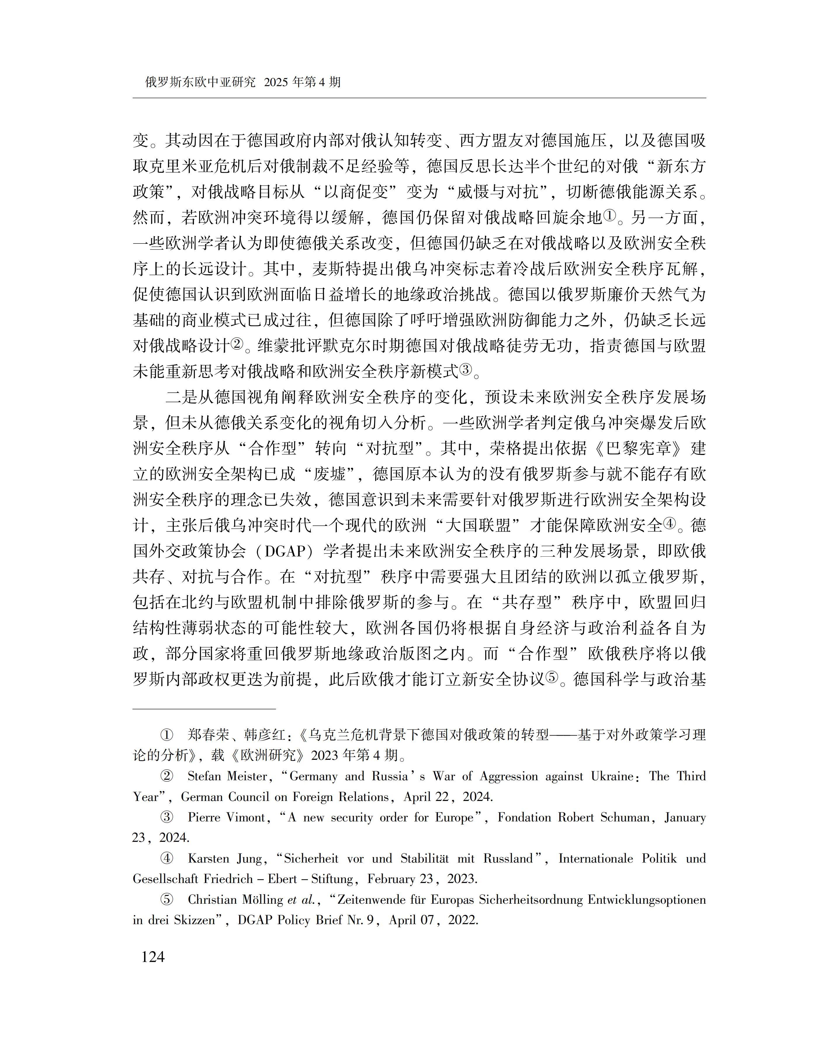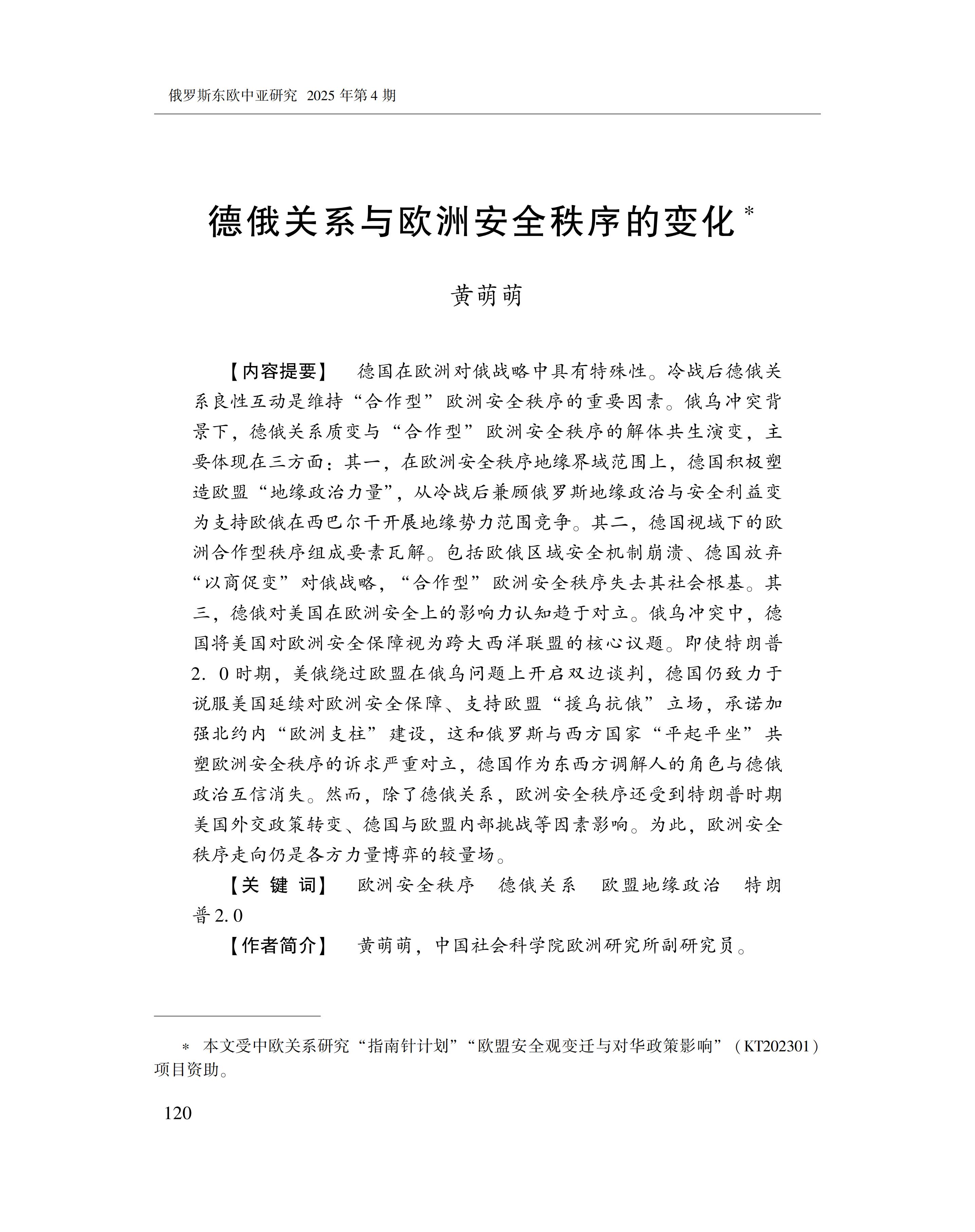 黄萌萌:德俄关系与欧洲安全秩序的变化 2025-09-23 黄萌萌 《俄罗斯东欧中亚研究》2025年第4期 0 作者简介:黄萌萌,中国社会科学院欧洲研究所副研究员。 文章来源:《俄罗斯东欧中亚研究》2025年第4期。已获得作者授权。