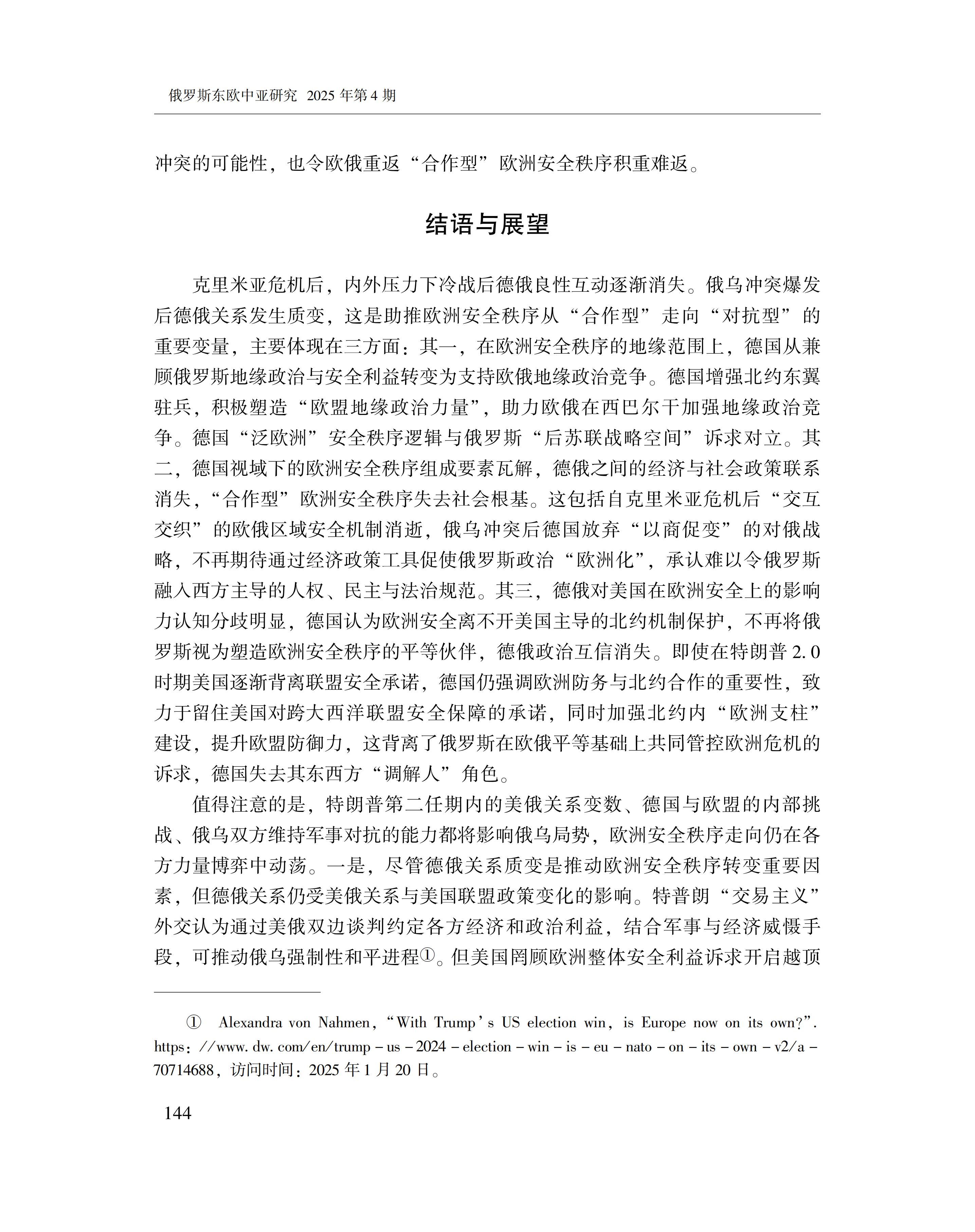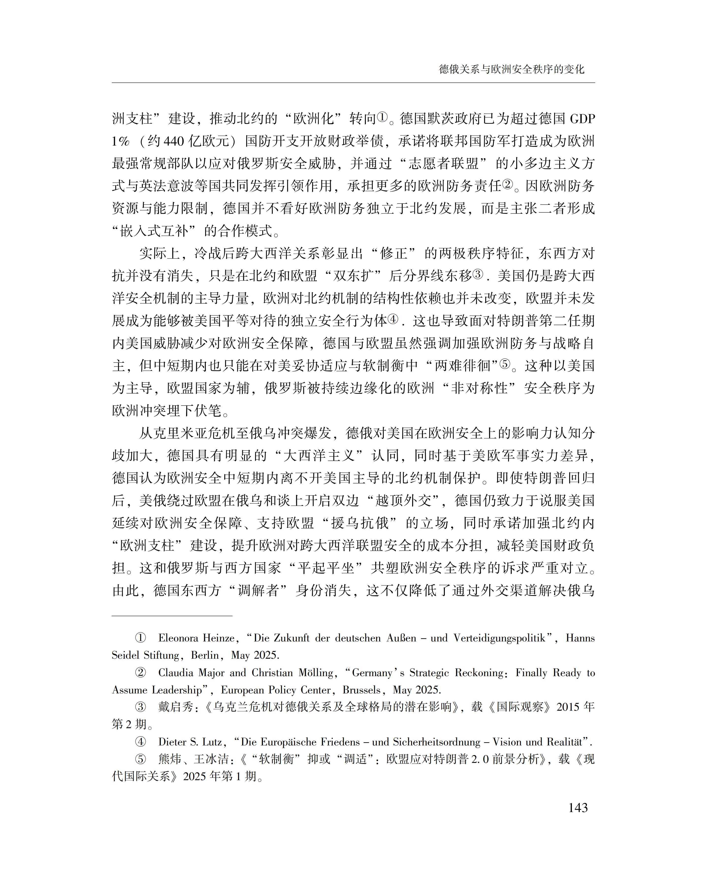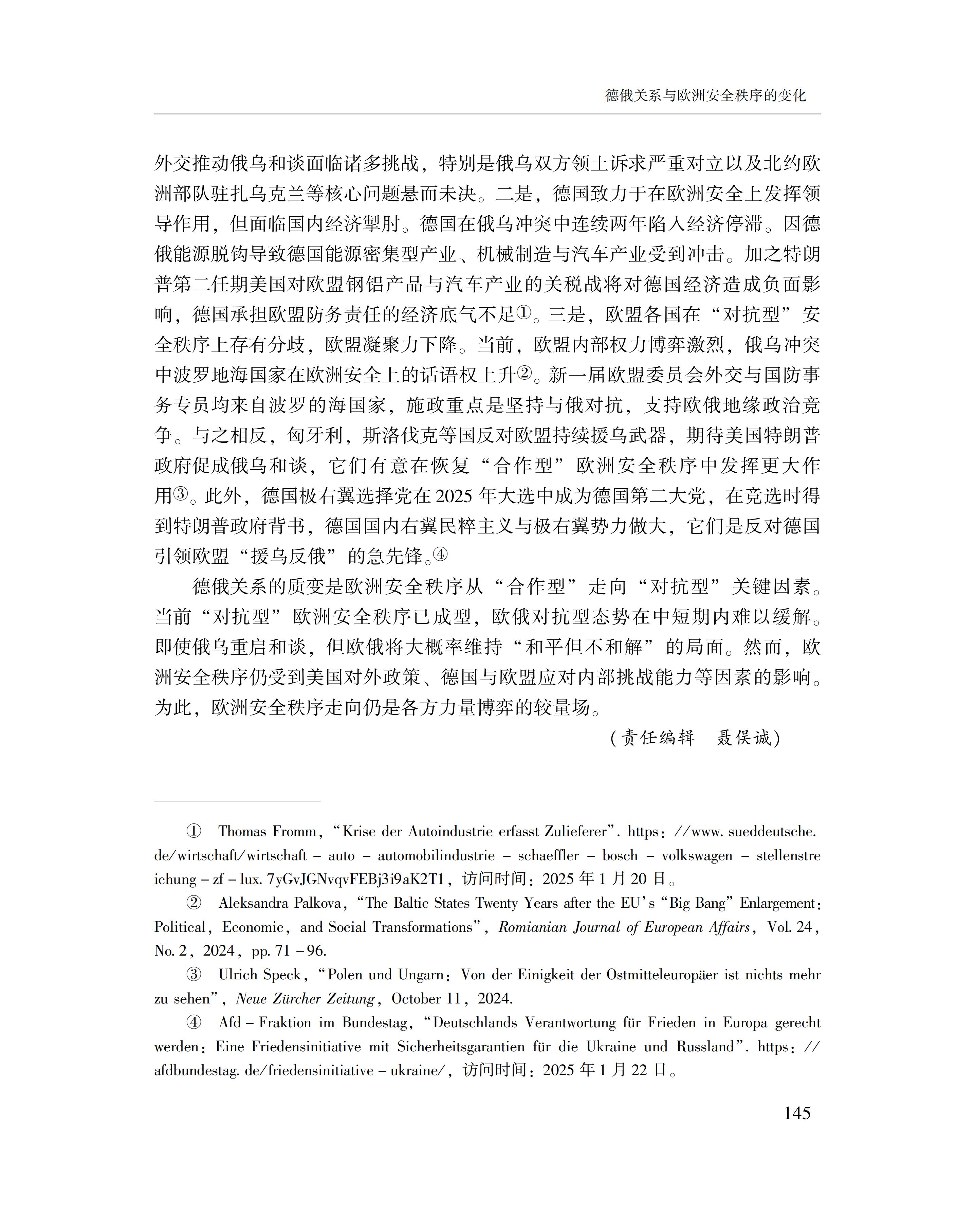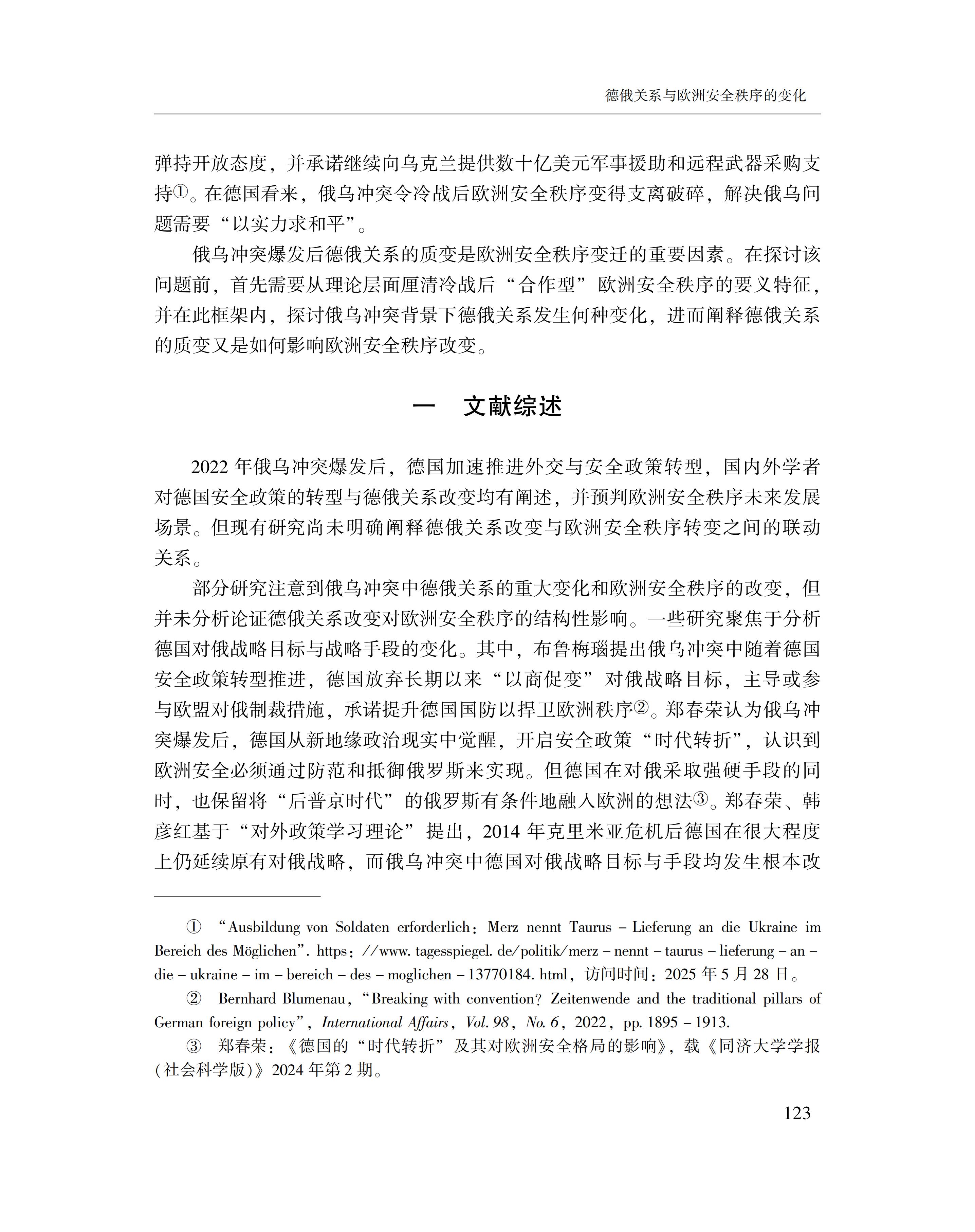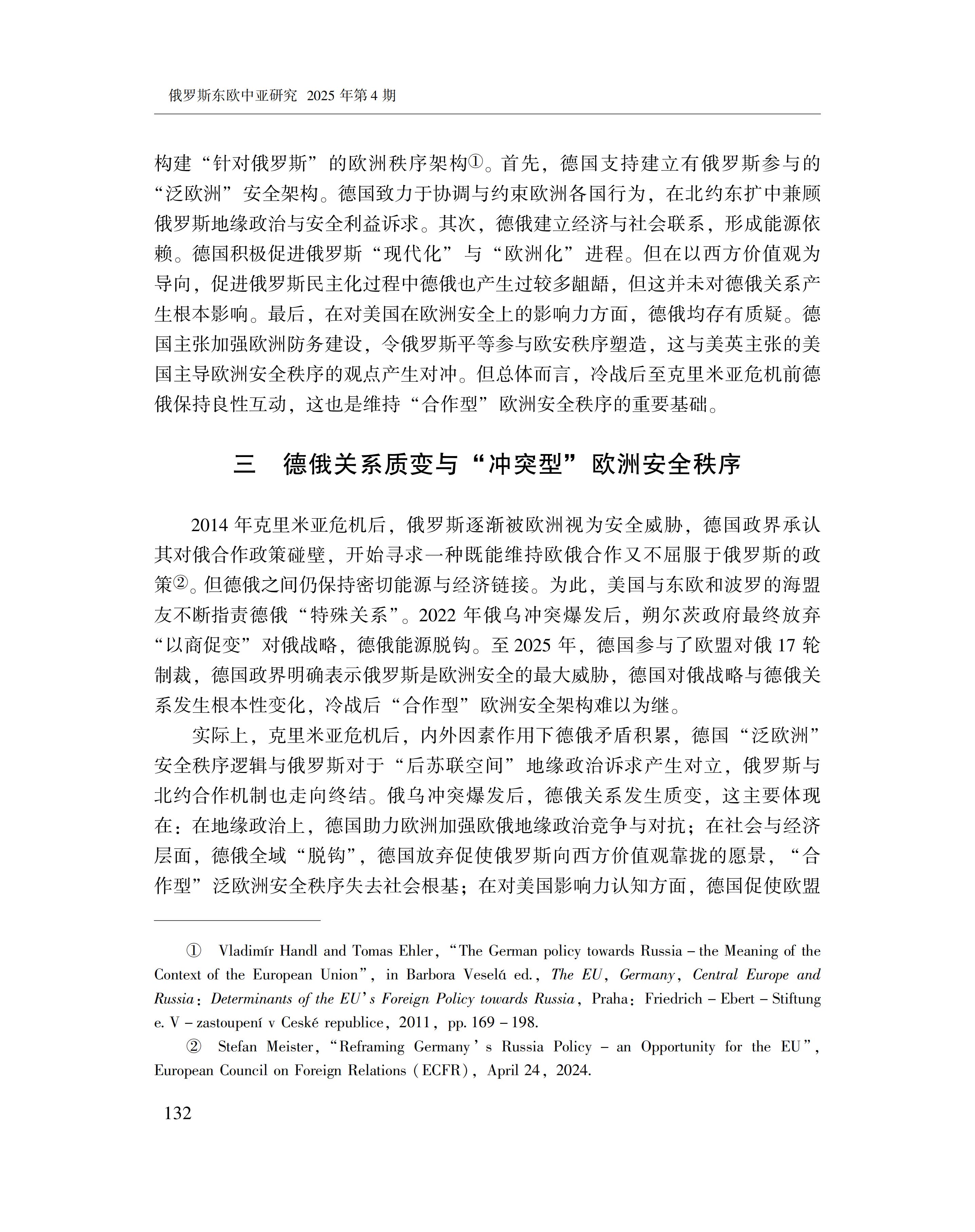 黄萌萌:德俄关系与欧洲安全秩序的变化 2025-09-23 黄萌萌 《俄罗斯东欧中亚研究》2025年第4期 0 作者简介:黄萌萌,中国社会科学院欧洲研究所副研究员。 文章来源:《俄罗斯东欧中亚研究》2025年第4期。已获得作者授权。