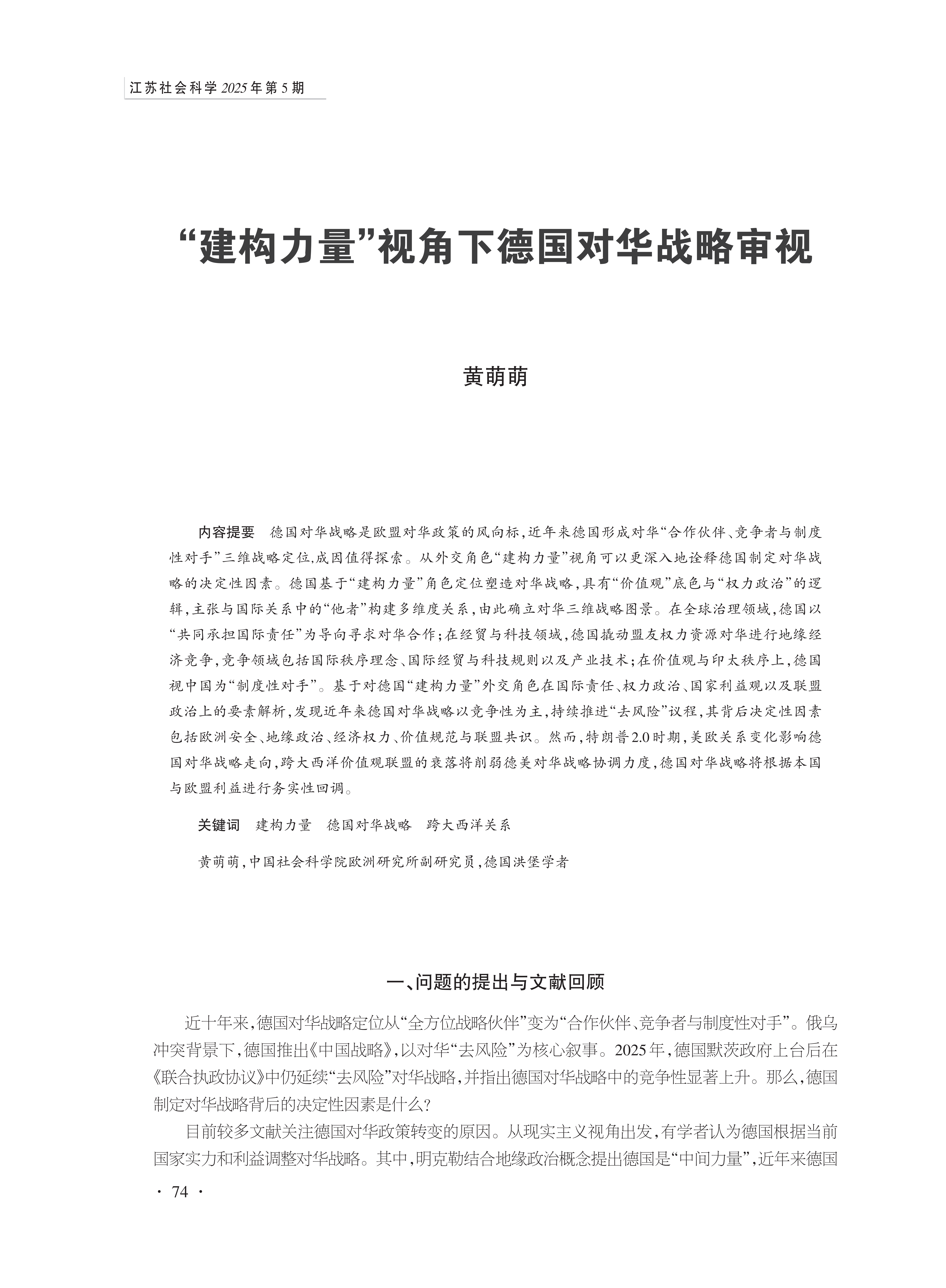 黄萌萌:“建构力量”视角下德国对华战略审视 2025-11-14 黄萌萌 《江苏社会科学》2025年第5期 0 作者简介:黄萌萌,中国社会科学院欧洲研究所副研究员。 文章来源:《江苏社会科学》2025年第5期。已获得作者授权。
