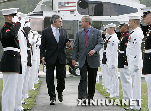 7月29日,美国总统布什(右)在马里兰州的戴维营欢迎英国首相布朗到访。这是布朗上任以来英美首脑首次举行会晤,双方将讨论包括伊拉克、伊朗、阿富汗、中东以及气候变化在内的一系列重要问题。 新华社发