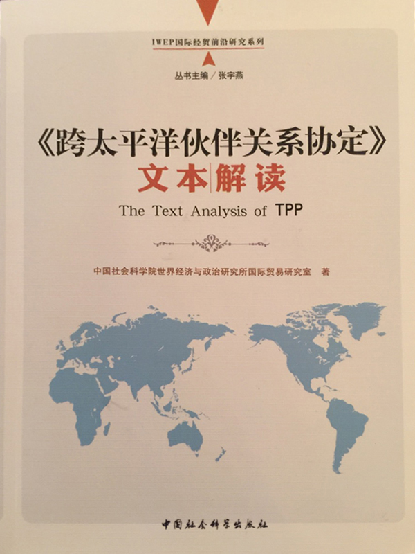 《跨太平洋伙伴关系协定文本解读》(The Text Analysis of TPP)由中国社会科学院世界经济与政治研究所国际贸易研究室著,中国社会科学出版社2016年1月出版。来自中国社会科学院、商务部研究院、中央财经大 学、对外经贸大学、山东财经大学、中国人民大学和江苏省社科院约三十名学者就“国际经贸新规则及其发展趋势”、“国际经贸新规则与中国开放型经济新战略”、“国际经贸新规则与江苏开放型经济”三个专题进行热烈研讨。