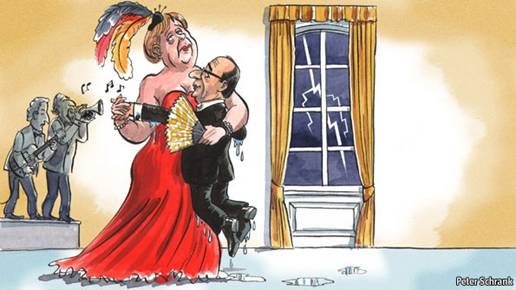 在下面的这一漫画中,奥朗德似乎是配角,而且很不自在。但不管怎么说,默克尔与奥朗德能在一起跳舞,无疑是欧洲的福音,也是世界的福音。