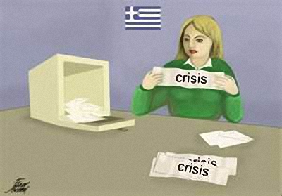 6月17日,希腊举行今年的第二次议会选举。在这一幅漫画中,检票员打开的选票上都写着“危机”。确实,今天的希腊遭遇的不仅仅是债务危机,而且还有社会危机和政治危机。
