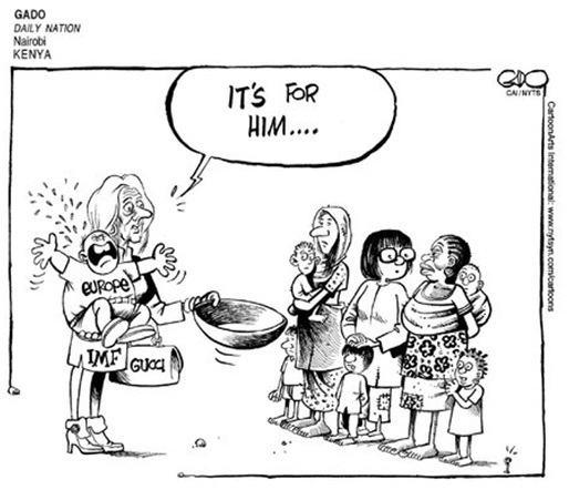 在这一幅漫画中,IMF总裁拉加德一手抱着大声哭泣的欧洲,一手伸出要饭碗,向发展中国家乞讨,并且还说,她是为欧洲要饭的(It’s for him.)。