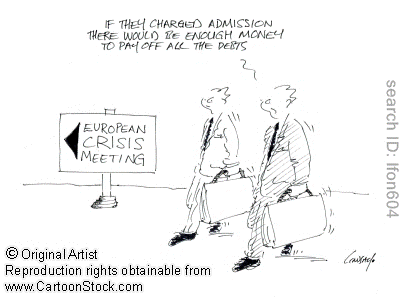 在这一漫画中,指路牌上写着:“欧洲危机会议”。有两个人正在走向会场,其中一人说:“如果他们收取会议入场费的话,他们可能有足够的钱来还债了。”
