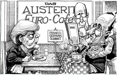 这一幅漫画生动地表达了默克尔与奥朗德的差异。在一家名为“紧缩”的欧元区咖啡店里,默克尔仅仅要了一段香肠和一杯白开水,餐桌布也不用,调料也没有。而她对面的奥朗德却不仅要了一个大鸡腿,而且还点了汤和面包,调料也有多种。更使默克尔惊诧不已的是,奥朗德居然还指着菜谱,要点一瓶酒。瞧他的餐桌布上,已放满了各种好吃的。 在危机时期,适度的“勒紧裤腰带”也是必要的。但紧缩不是包治百病的灵丹妙药。令人欣慰的是,默克尔越来越认识到,在危机时期,片面强调紧缩是不利于摆脱危机的。奥朗德对财政紧缩的批评是在他竞选时的立场。如今他已入主爱丽舍宫,因此,可以预料,他对紧缩与扩大消费的关系的看法也会发生一定的变化。