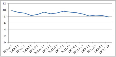 一是人民币汇率被升值。汇率对出口商品的竞争力有着较为重要的影响。2010年月1日,人民币对欧元的汇率为9.797¥=1€,而在2012年5月23日,人民币对欧元的汇率跌破8.000¥=1€。这样一种变化显然使中国对欧出口产品处于不利地位。