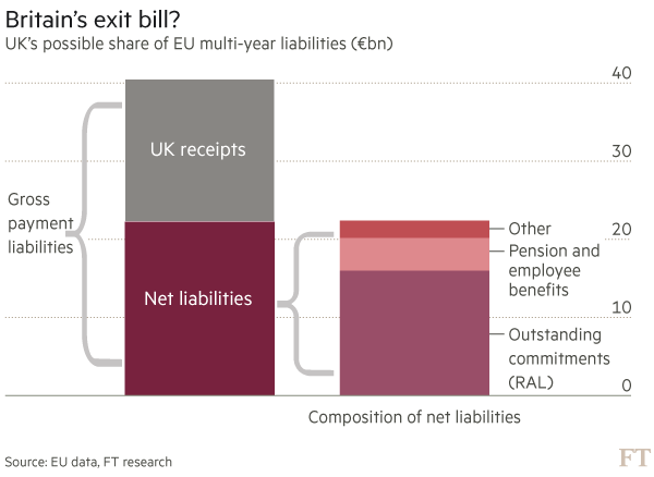 谁也不可能算出精确的退欧账单,它将取决于政治协议。然而,来自英国以外四个欧盟国家的官员们在审议了英国《金融时报》的估算后表示,它们合理代表了相关金额。