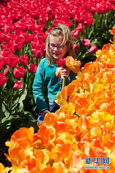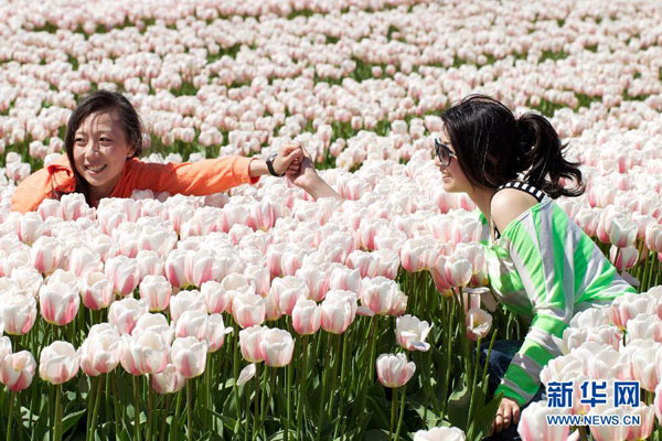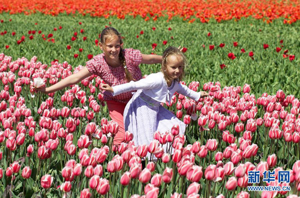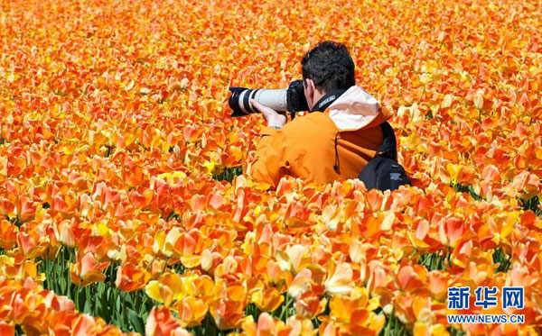 5月9日,在荷兰西部诺德维克近郊,游人在郁金香花田游览。 近日,荷兰气温稳步升高,郁金香进入盛开期。