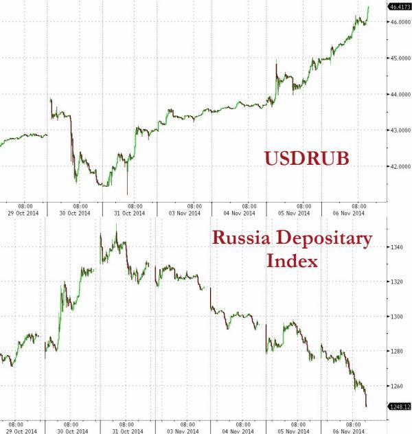 (美元/卢布汇率及俄罗斯凭证指数图,来源:《华尔街日报》)
